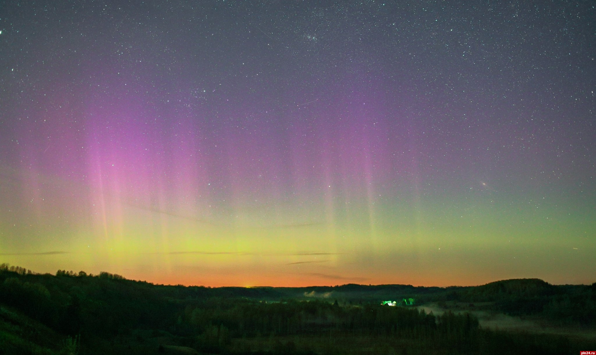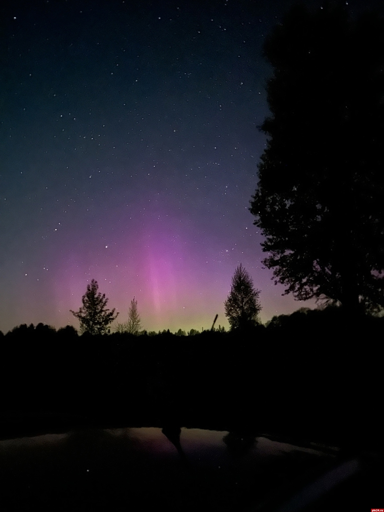Северное сияние над Псковской областью запечатлел псковский астроном-любитель Петр Митрофанов в ночь с 1 на 2 мая. Снимками он поделился в группе «АстроПсков» в соцсети «ВКонтакте».
