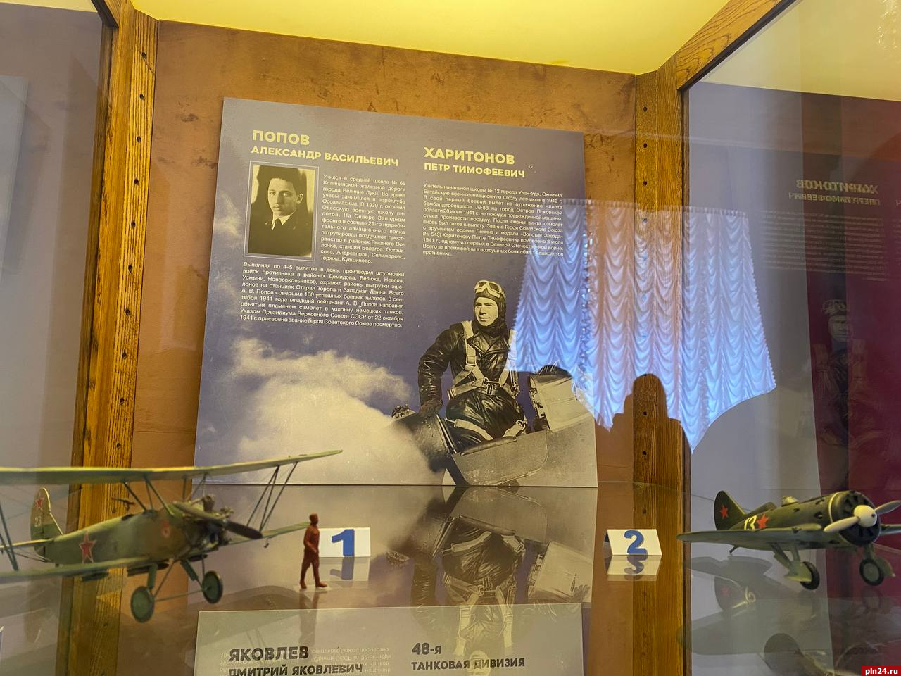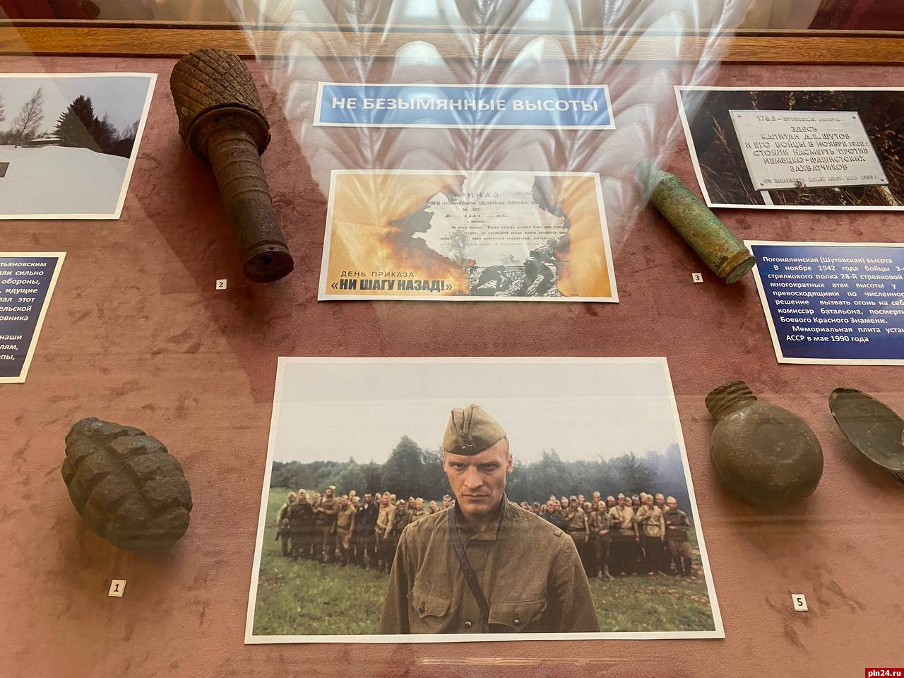 Одно из них изображено на картине, которая открывает новую выставку в холле перед парадным залом - «Бои у Ступинской высоты». Работу написал в 2018 году великолукский художник Олег Александров и подарил знаменитой великолучанке Марии Сизовой в честь её 95-летия со дня рождения. Участница Сталинградской битвы, боев на Ступинской высоте и других исторических сражений ныне здравствует, в этом году ей исполнился 101 год.