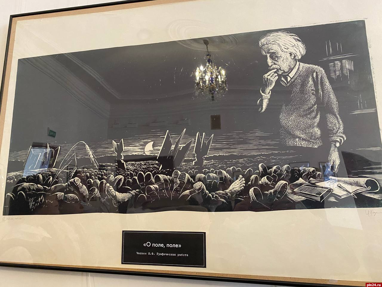 Выставку «На земле, опалённой войной» дополнила графика самодеятельного художника Игнатия Чапкина, более 100 работ которого сегодня хранятся в Литературно-художественном музее имени писателя И. Васильева в деревне Борки Великолукского района. В прошлом году директор учреждения Ольга Андреевская откликнулась на предложение поучаствовать в выставке «Ковалевская и космос» в Полибино, а на этот раз предоставила 16 линогравюр не тему Великой Отечественной войны.