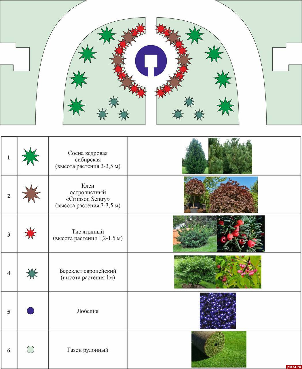 Планировка территории сохранится прежней, но планируется заменить растения и обновить покрытие дорожки и проезда. На месте старых деревьев высадят кедровые сибирские сосны, а по внутренней части круга - ягодный тис и остролистные клёны. Вдоль тротуара появятся несколько кустов европейского бересклета.