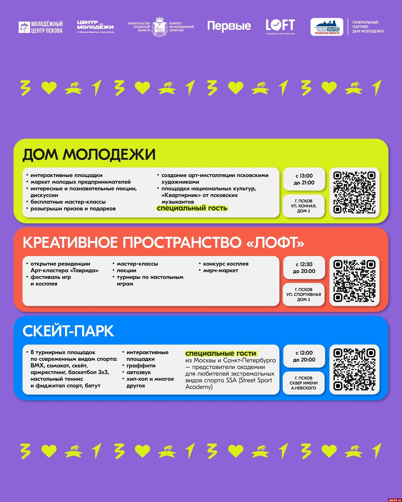 В Пскове праздник развернется одновременно на трех локациях. С 13:00 до 20:00 в Доме молодежи гостей будут ждать интерактивные площадки, маркет молодых предпринимателей, познавательные лекции, дискуссии, бесплатные мастер-классы, розыгрыши призов и подарков. Участники смогут увидеть создание арт-инсталляции от псковских художников.