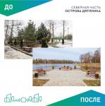 Также работы велись в северной части острова Дятлинка, где была создана парковая зона. Проект предусматривал устройство освещения, тротуаров, установку детского игрового комплекса, скамеек и урн.