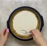 Печенье измельчаем в крошку и добавляем к нему растопленное сливочное масло. Перемешиваем руками и распределяем стаканом по форме. Когда основа готова, отправляем форму в морозилку на 10 минут.