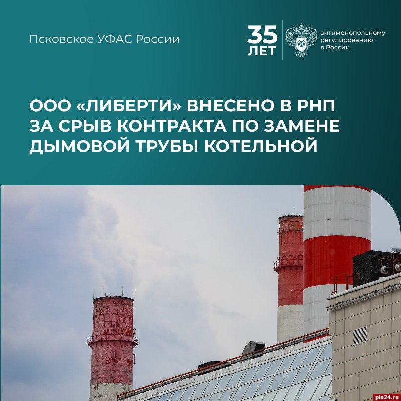 Компания «Либерти» из Челябинска включена в реестр недобросовестных поставщиков (РНП) на два года за срыв контракта по замене дымовой трубы котельной в деревне Выбор Новоржевского муниципального округа, сообщили Псковской Ленте Новостей в псковском управлении ФАС России.