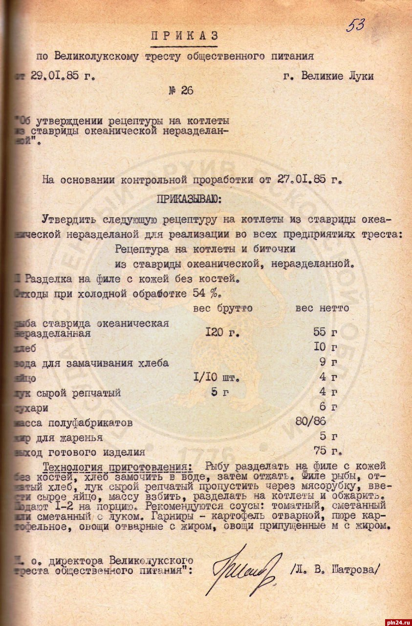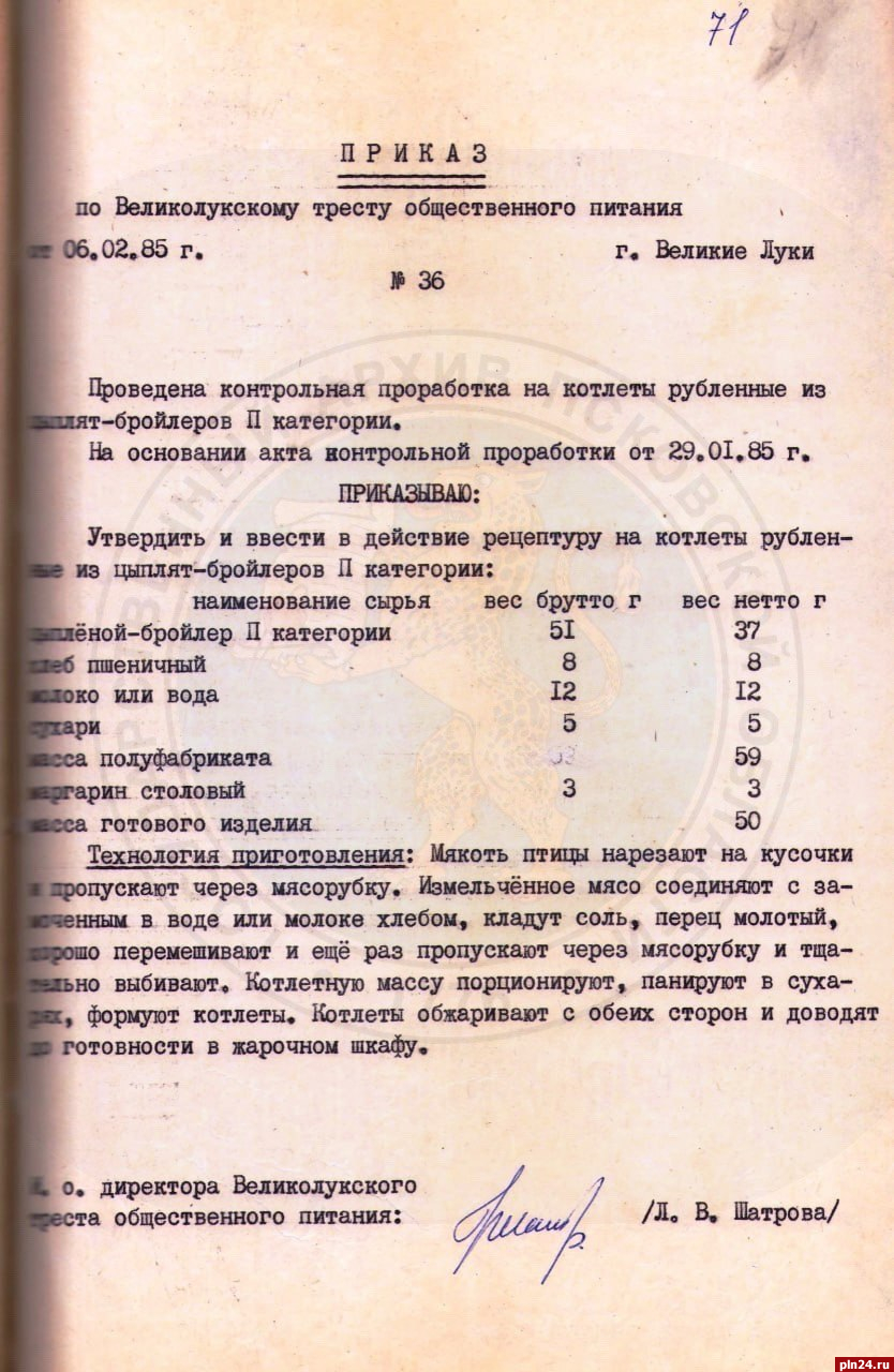 Рецепты приготовления двух видов котлет, утвержденные Великолукским трестом общественного питания в 1985 году, обнародовал Государственный архив Псковской области.
