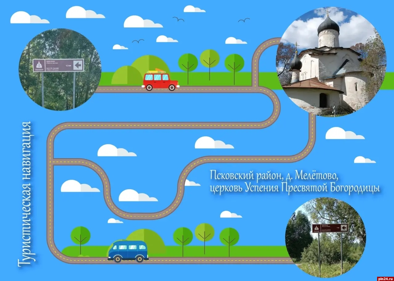 Так, два знака ведут к храму Успения Пресвятой Богородицы в деревне Мелетово – примеру классической псковской архитектуры культового зодчества середины XV века. Так же один из указателей обозначает видовую площадку на реку Великую со смотровой площадки в дерене Родина, еще один к арт-кластеру «Таврида», еще один указатель ведет к местам размещения – отелю в деревне Черёха. Знаки выполнены в едином международном формате: на коричневом фоне нанесены специальная пиктограмма, характеризующая объект, и его название на русском и английском языках.