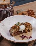 Классика в идеальной подаче — блины с говяжьим языком и грибным соусом, сырники со сметаной и, конечно, домашние десерты: торт «Медовик», «Наполеон» и чизкейк «Сан Себастьян» с ягодным конфи.