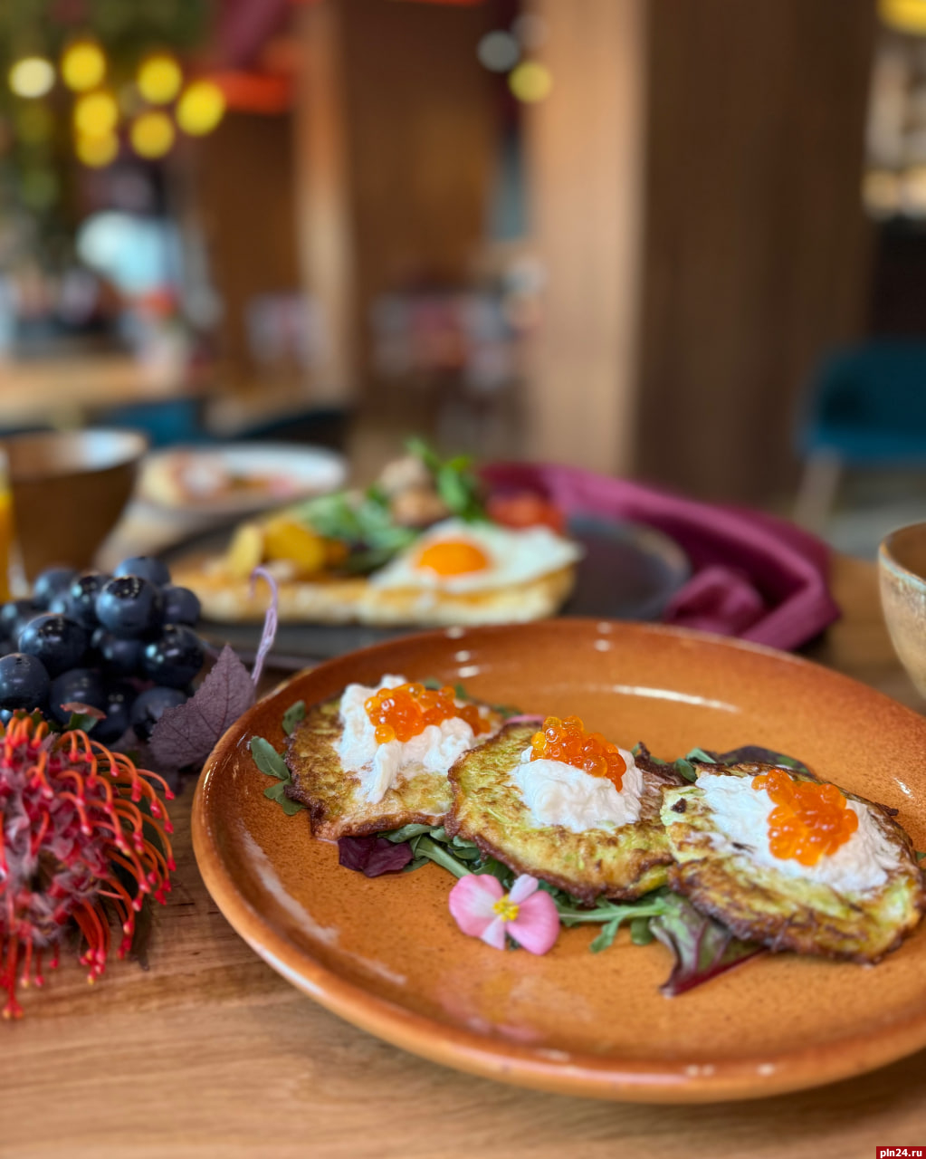 Особое внимание — драникам из кабачка со страчателлой и красной икрой и блинам из шпината с муссом из трески. Такие комбинации не просто утоляют голод — они вдохновляют на целый день.