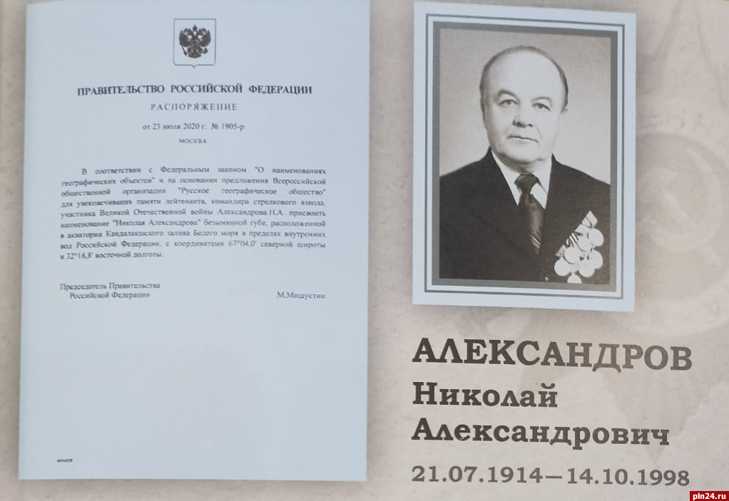 С 23 июля 2020 года, распоряжением правительства РФ, имя уроженца Псковской было присвоено безымянной губе, расположенной в акватории Кандалакшского залива Белого моря в пределах внутренних вод страны. Речь идет об увековечении памяти лейтенанта, командира стрелкового взвода, участника Великой Отечественной войны Александрова Николая Александровича. Об этом сообщили в Государственном архиве Псковской области.