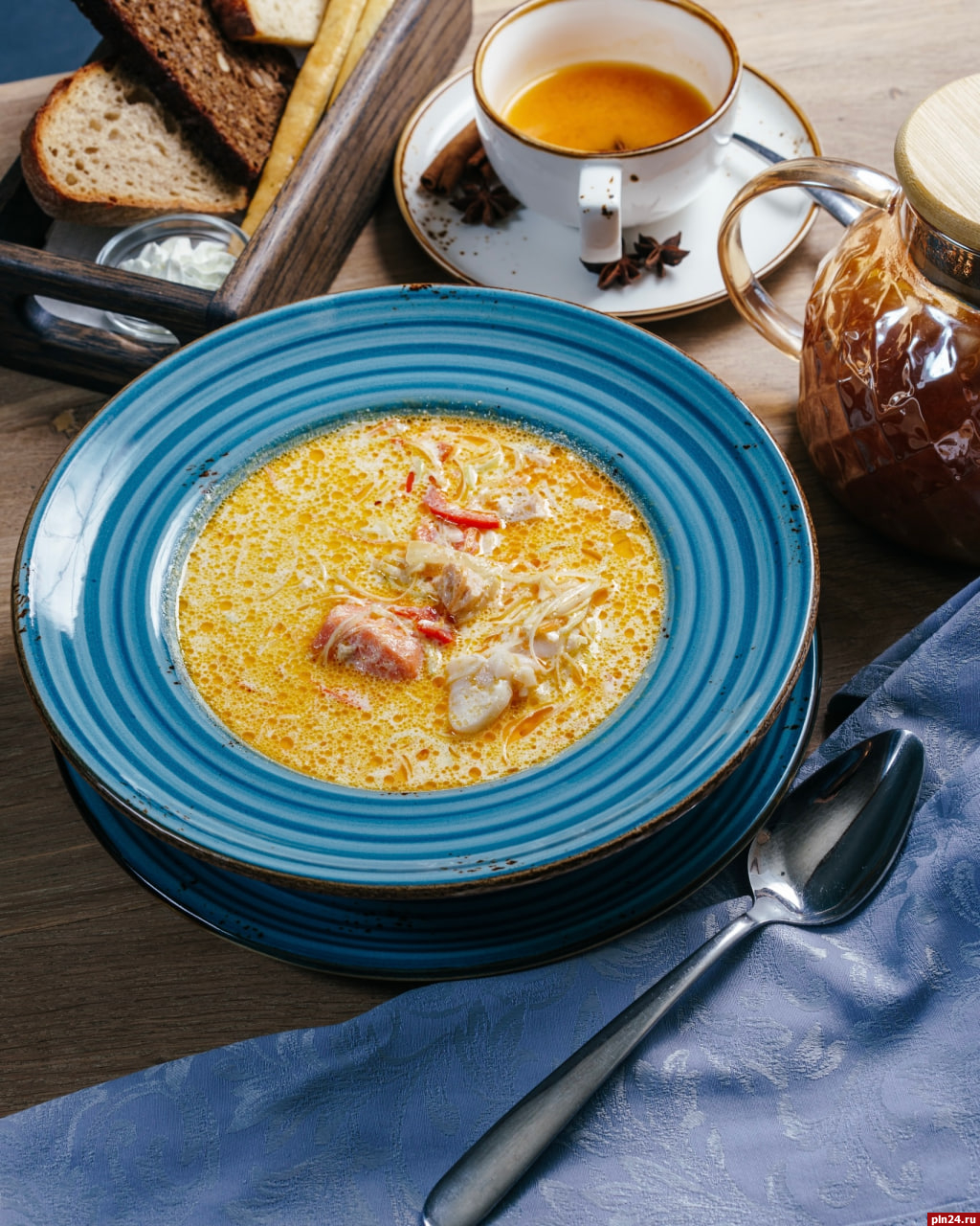 Блюдо готовят по тщательно продуманному рецепту: в нежном рыбном бульоне гармонично сочетаются сёмга и судак. Кулинары ресторана добавляют в уху лук-порей, репчатый лук, морковь и сладкий перец - эти ингредиенты придают супу особую глубину вкуса. Завершающий штрих - сливки, которые делают текстуру ухи бархатистой и изысканной.