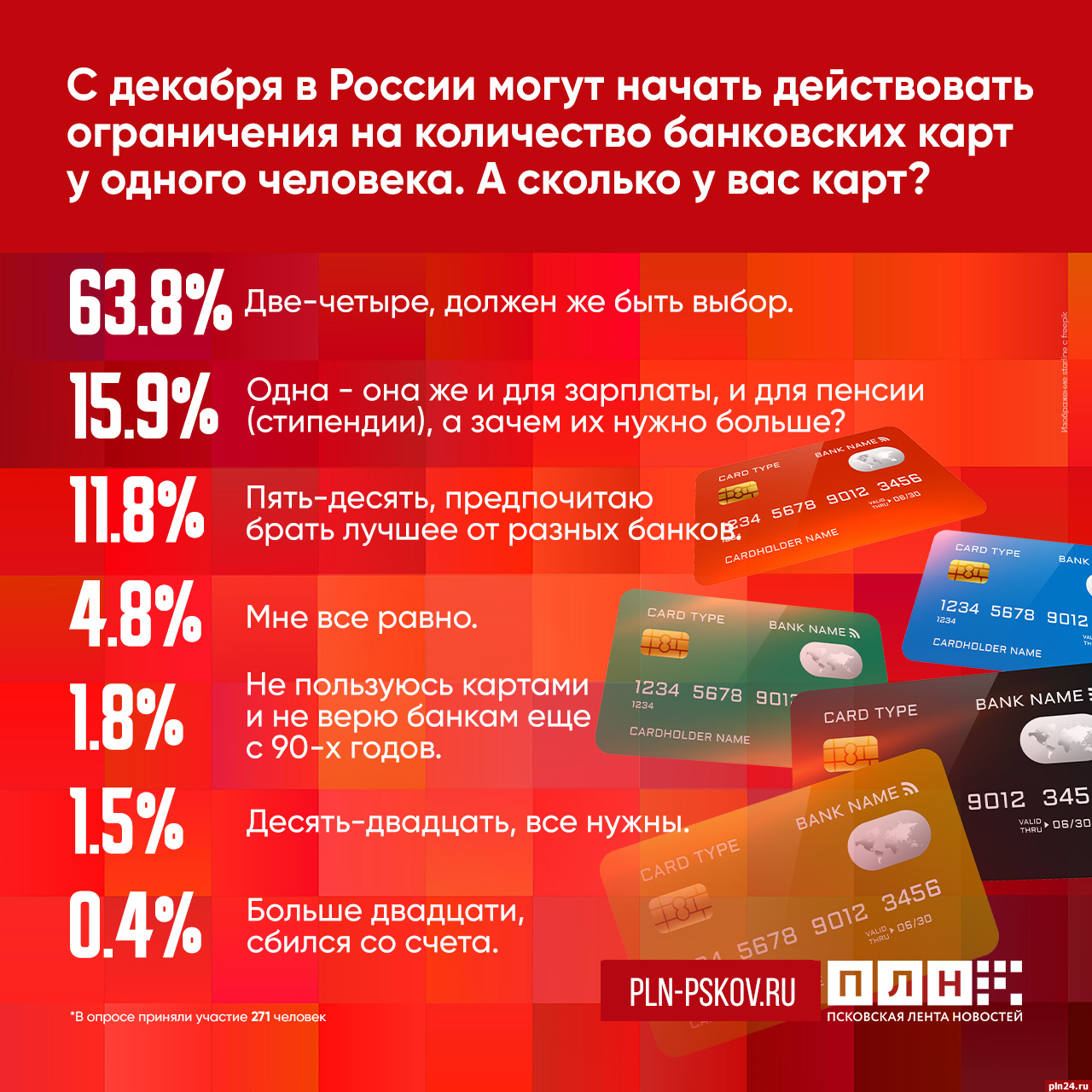 С декабря в России могут начать действовать ограничения на количество банковских карт у одного человека. Псковская Лента Новостей провела опрос, в котором принял участие 271 человек, и выяснилось, что более половины респондентов (63.8%) сейчас используют в повседневной жизни от двух до четырех банковских карт.