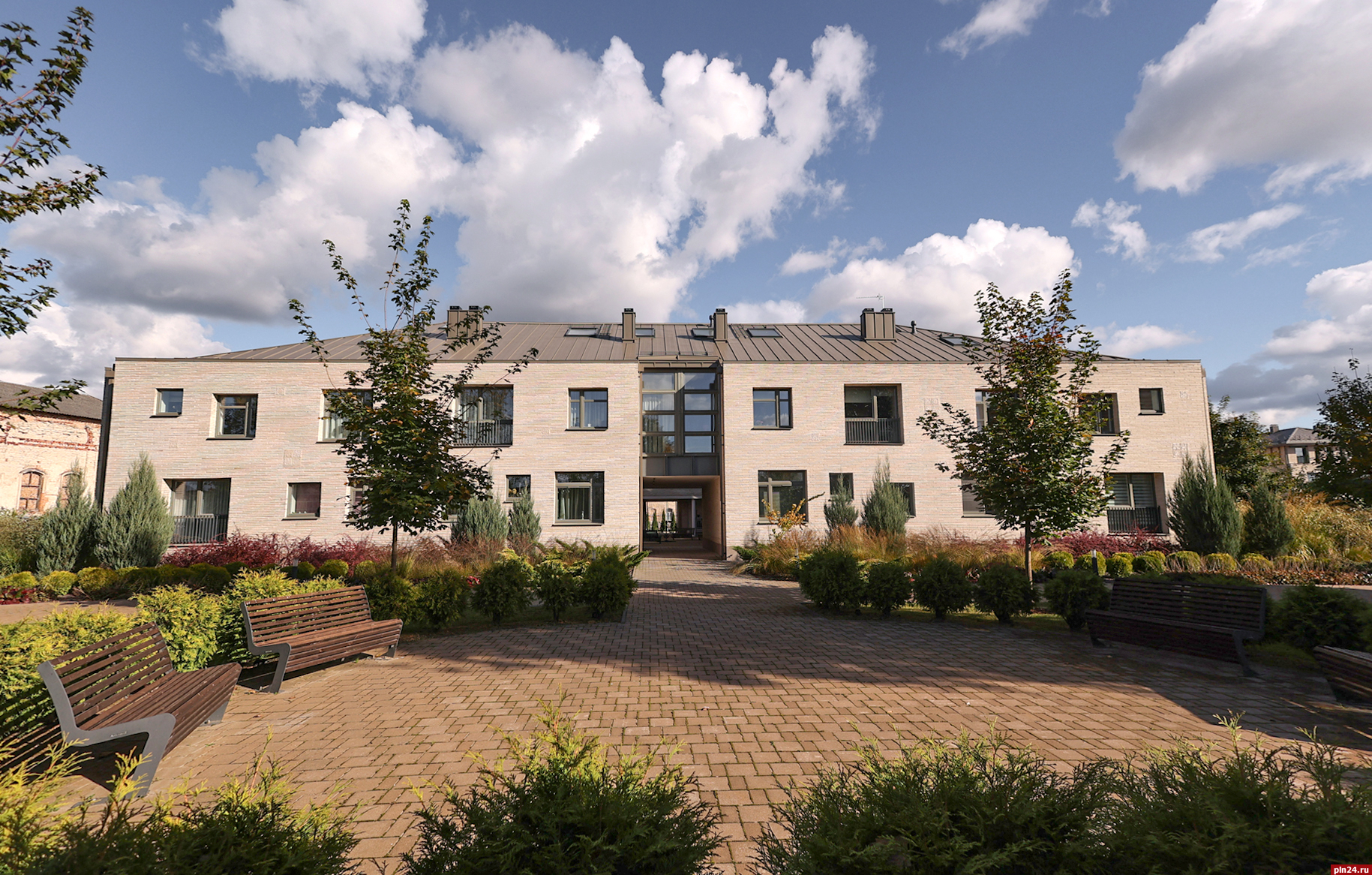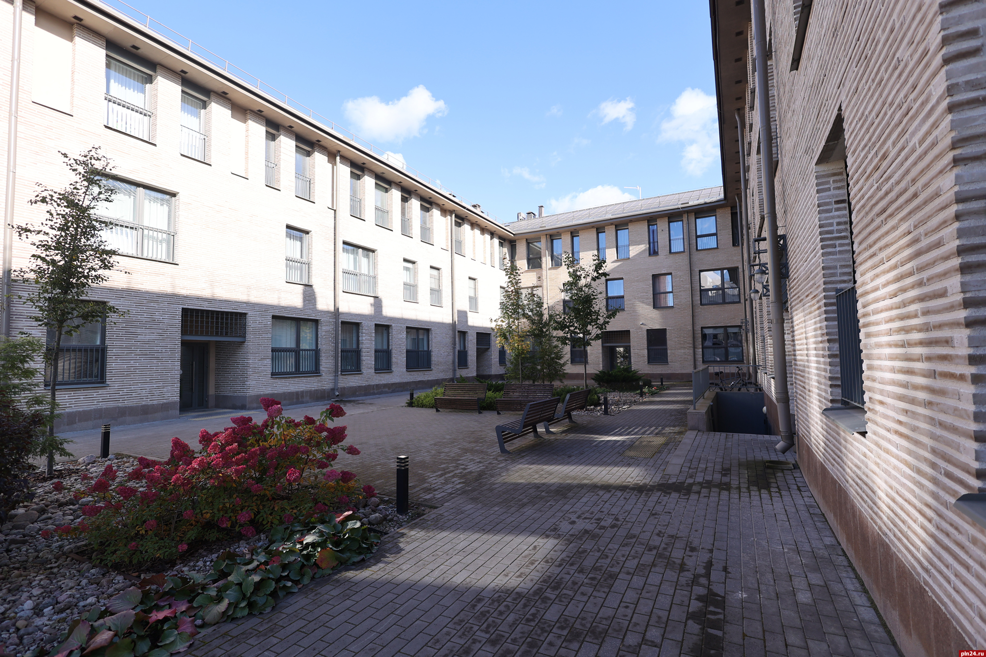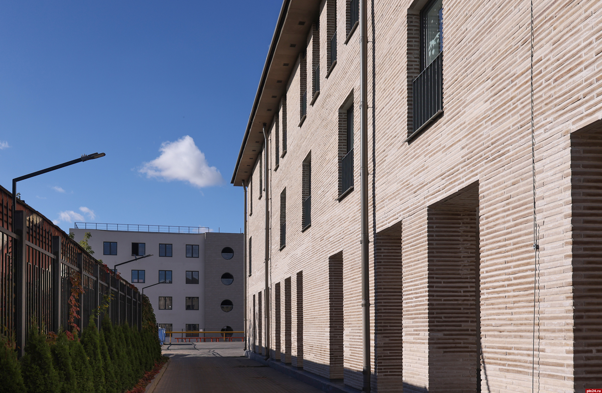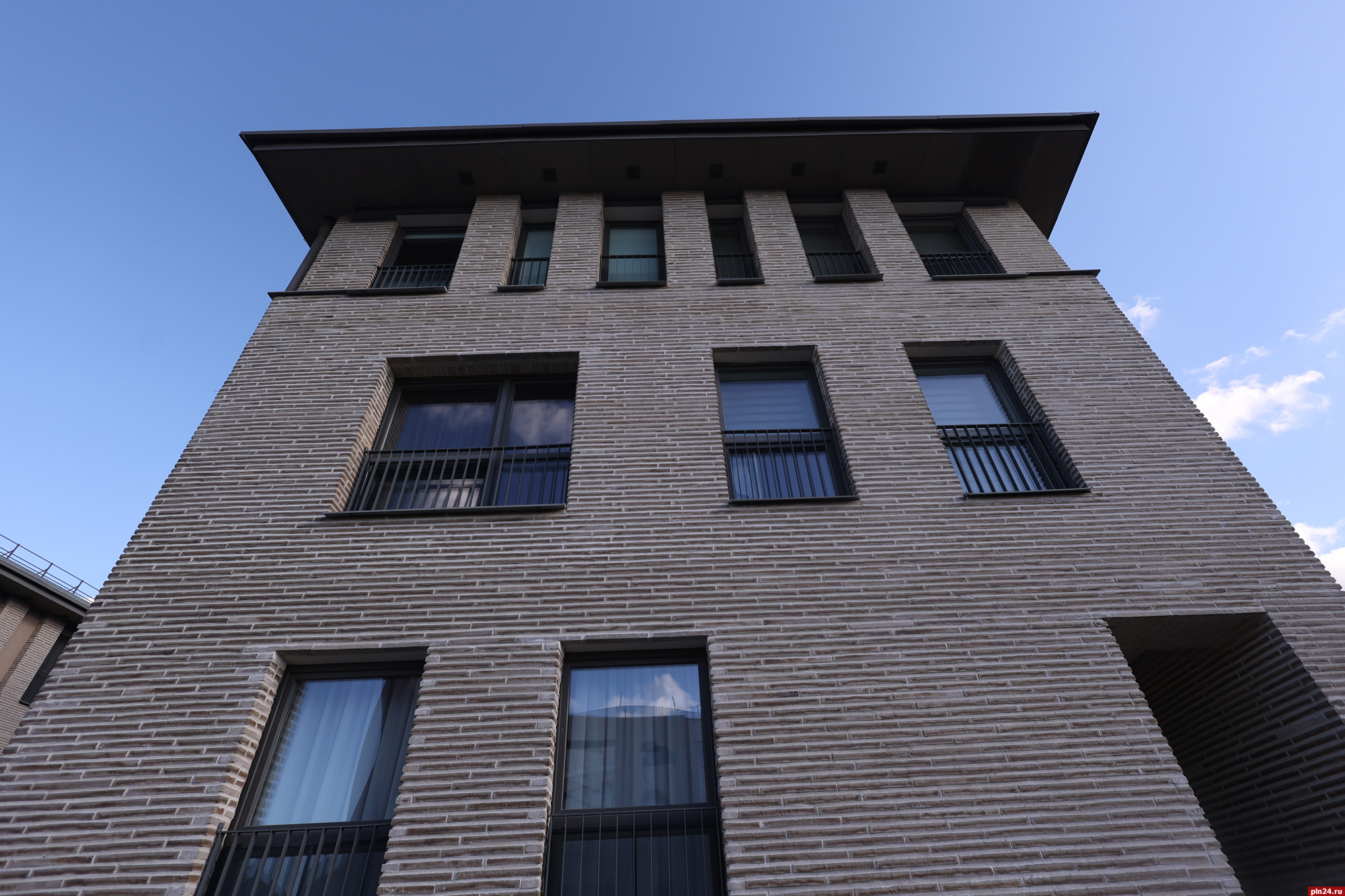 Парадный фасад «Надвратного дома» сам по себе является произведением искусства, притягивающим взгляды с улицы Советской. Отделка из ригельного кирпича не только подчеркивает статус, но и гармонично перекликается с историческим обликом крепостной стены Окольного города, филигранно вписывая новое строительство в архитектурный ансамбль исторического центра Пскова.