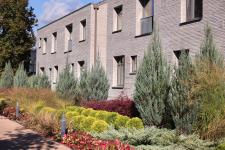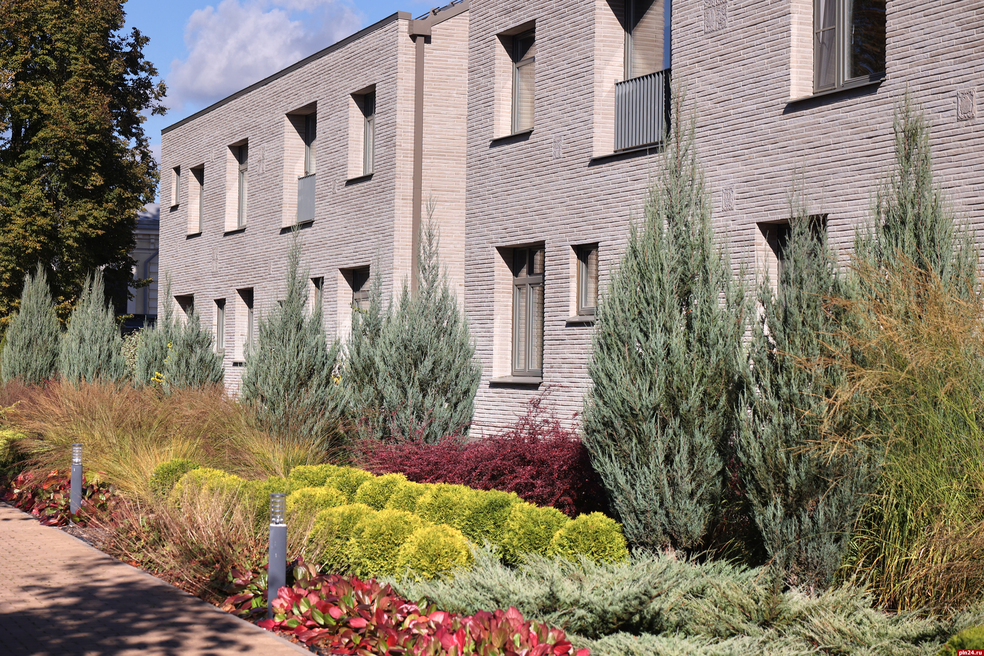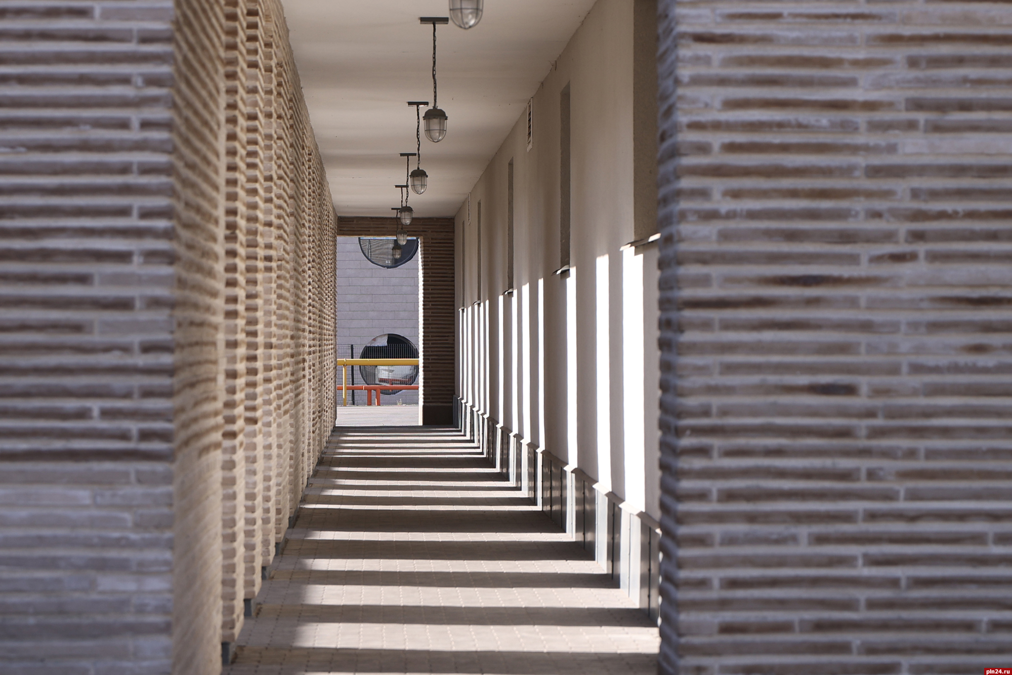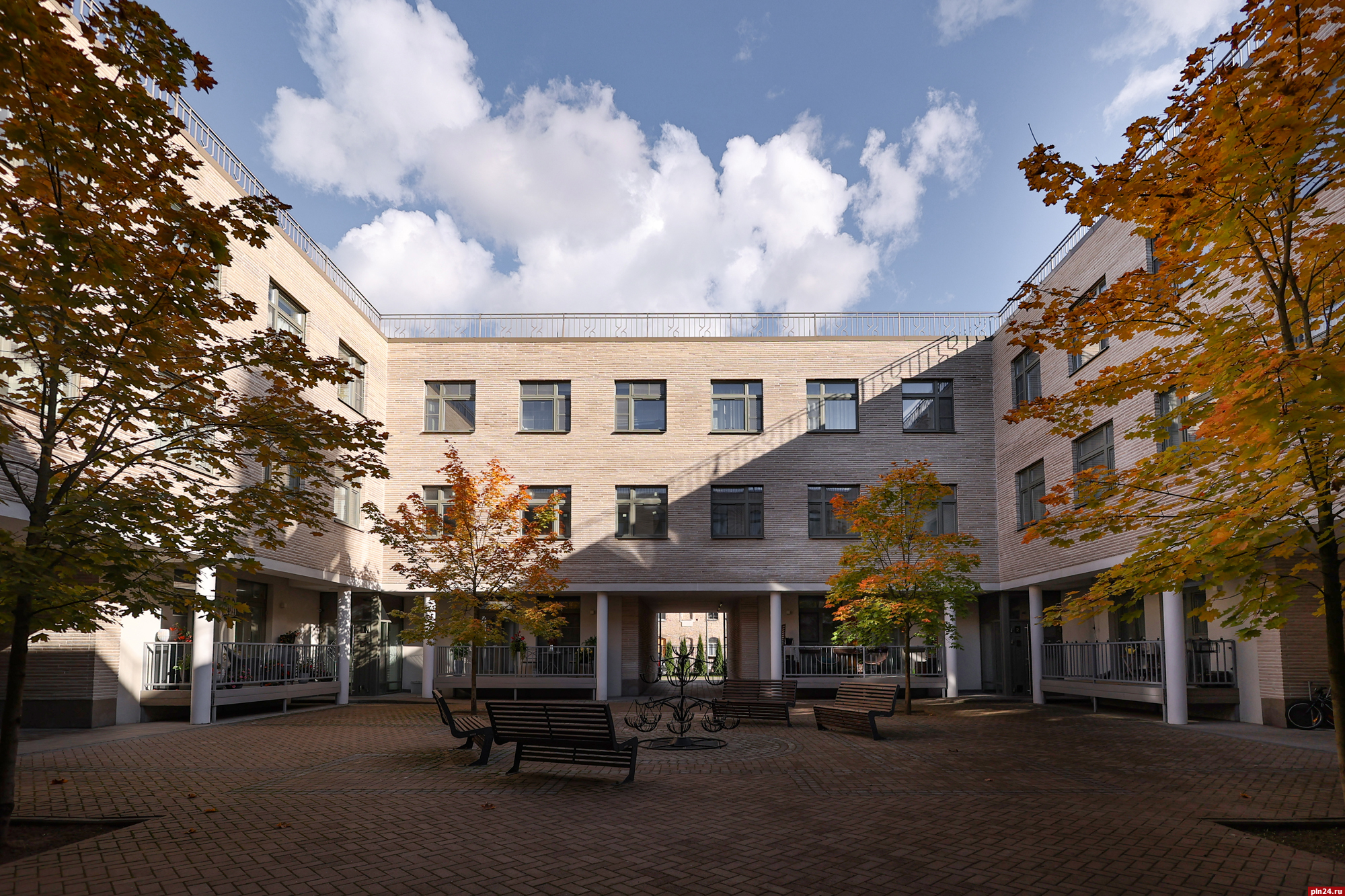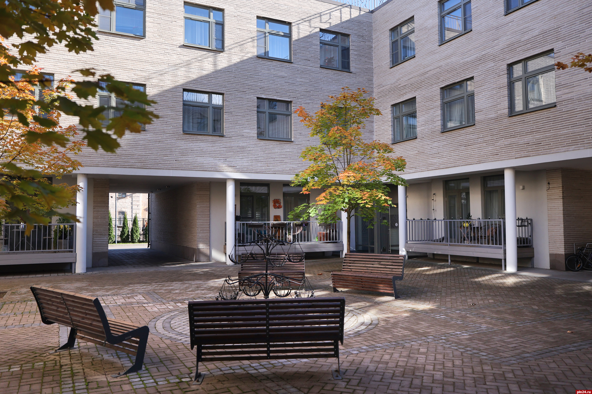 Парадный фасад «Надвратного дома» сам по себе является произведением искусства, притягивающим взгляды с улицы Советской. Отделка из ригельного кирпича не только подчеркивает статус, но и гармонично перекликается с историческим обликом крепостной стены Окольного города, филигранно вписывая новое строительство в архитектурный ансамбль исторического центра Пскова.