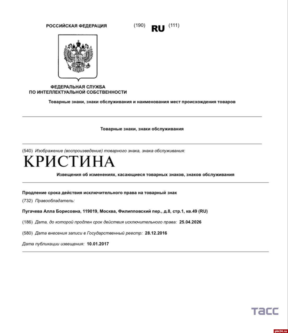 Последнее изменение статуса знака вносилось в декабре 2016 года. Тогда Алла Пугачева в последний раз продлевала срок действия исключительного права, который, согласно данным Роспатента, истекает 25 апреля 2026 года.
