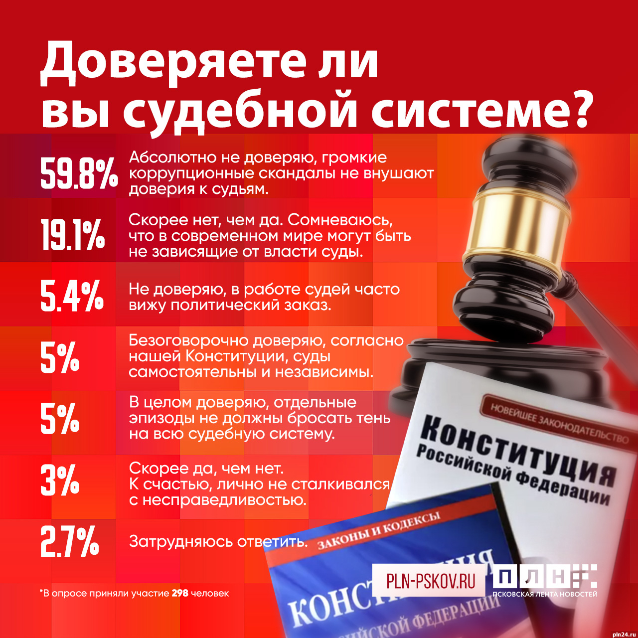 Результаты проведенного опроса свидетельствуют о кризисе доверия респондентов Псковской Ленты Новостей к судебной системе. Более половины опрошенных (59.8%) выбрали вариант «абсолютно не доверяю», характеризуя это тем, что громкие коррупционные скандалы не внушают доверия к судьям. В опросе приняли участие 298 человек.