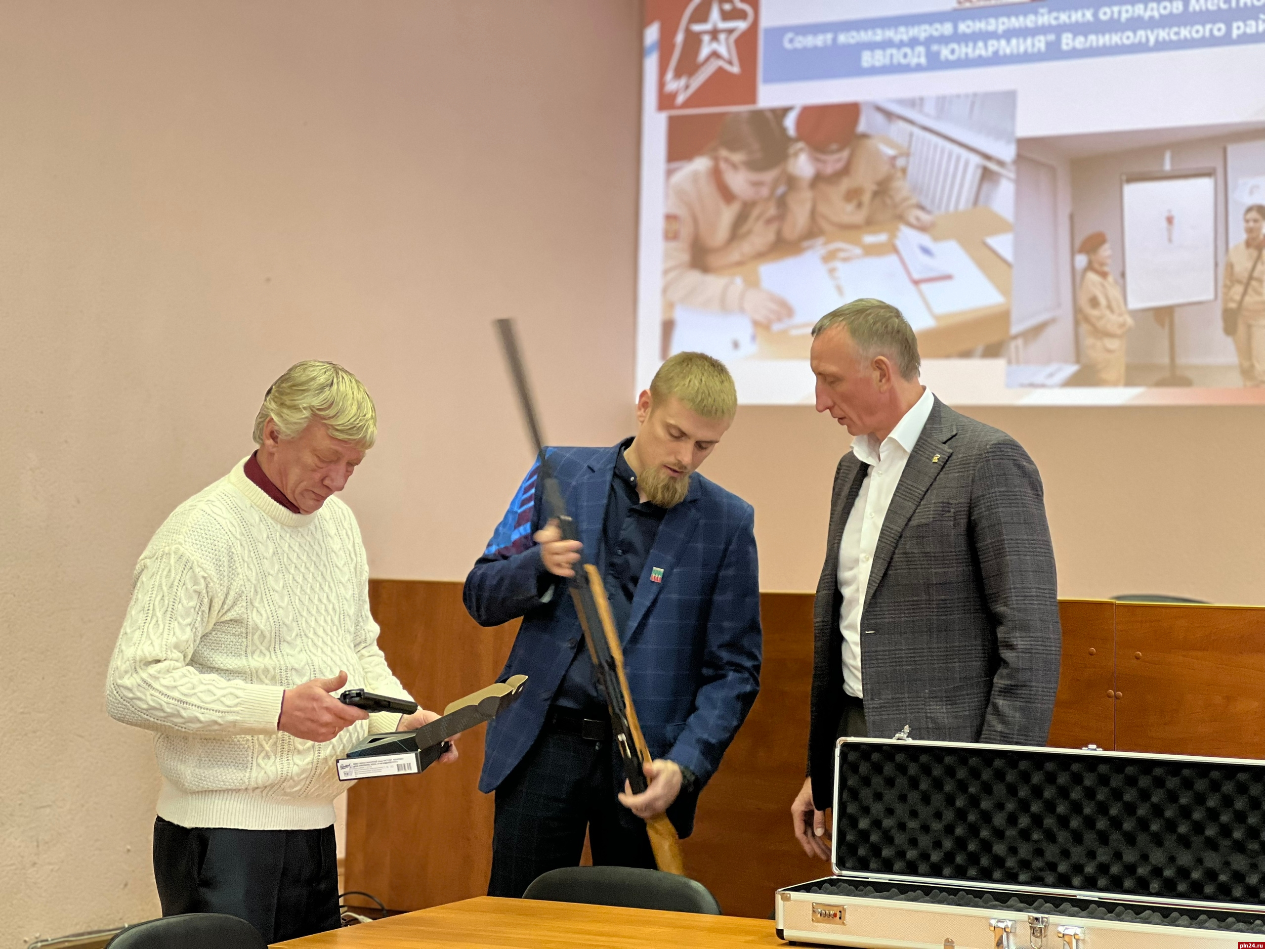 5 ноября депутат Государственной Думы от Псковской области, основатель фонда «Земляки», секретарь регионального отделения партии «Единая Россия» Александр Козловский вместе с главой Великолукского района Алексеем Кузьминым встретился с юнармейцами района. Парламентарий передал команде местного отделения «Юнармии» спортивную пневматическую винтовку и макет пистолета Макарова. Об этом он написал в соцсети ВКонтакте.