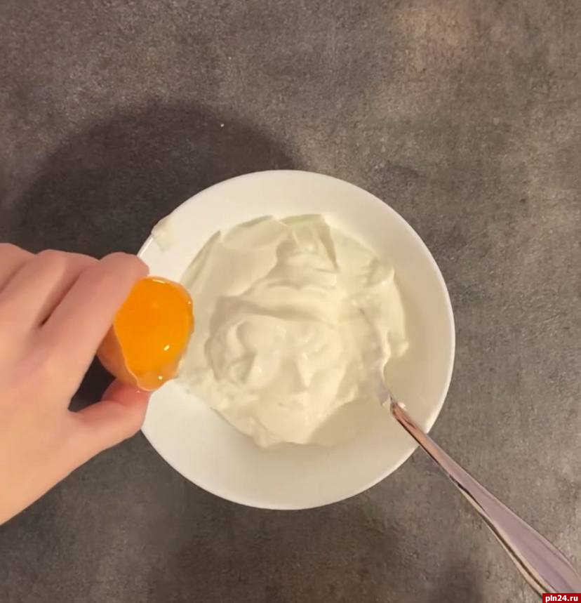 Для крема к сметане добавляем один яичный желток и сахарную пудру. Перемешиваем.