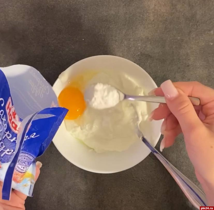 Для теста в миске смешиваем творог, одно целое яйцо и один яичный белок.