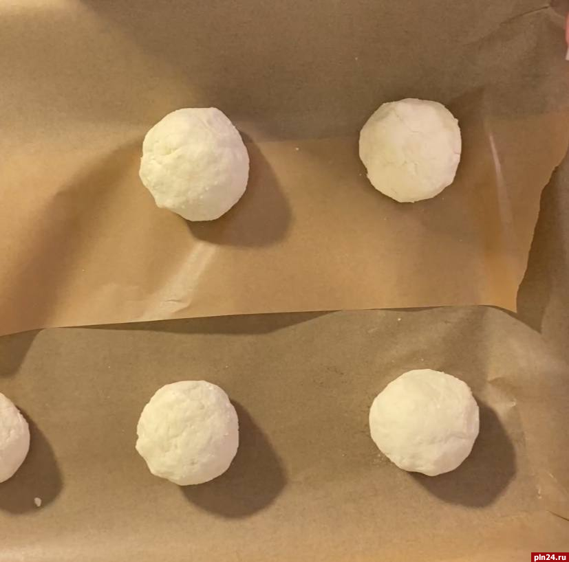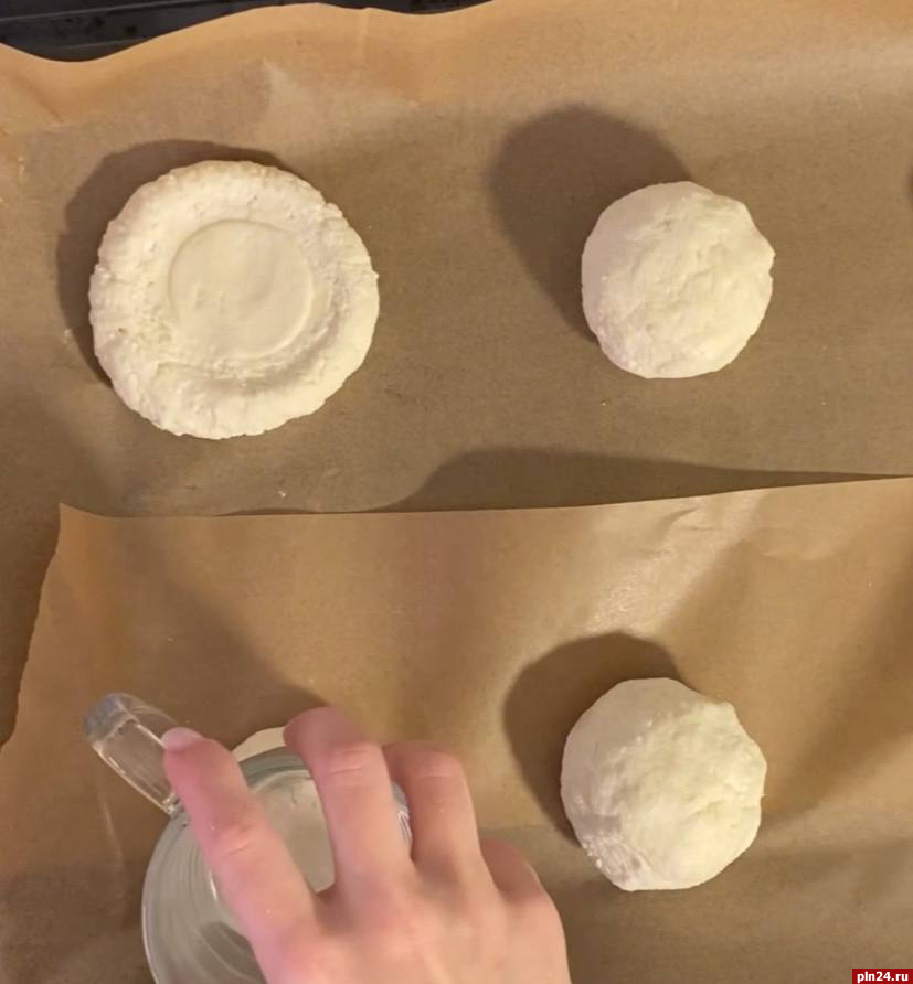 Выкладываем их на противень и расплющиваем любым стаканам, чтобы в середине получилось углубление.