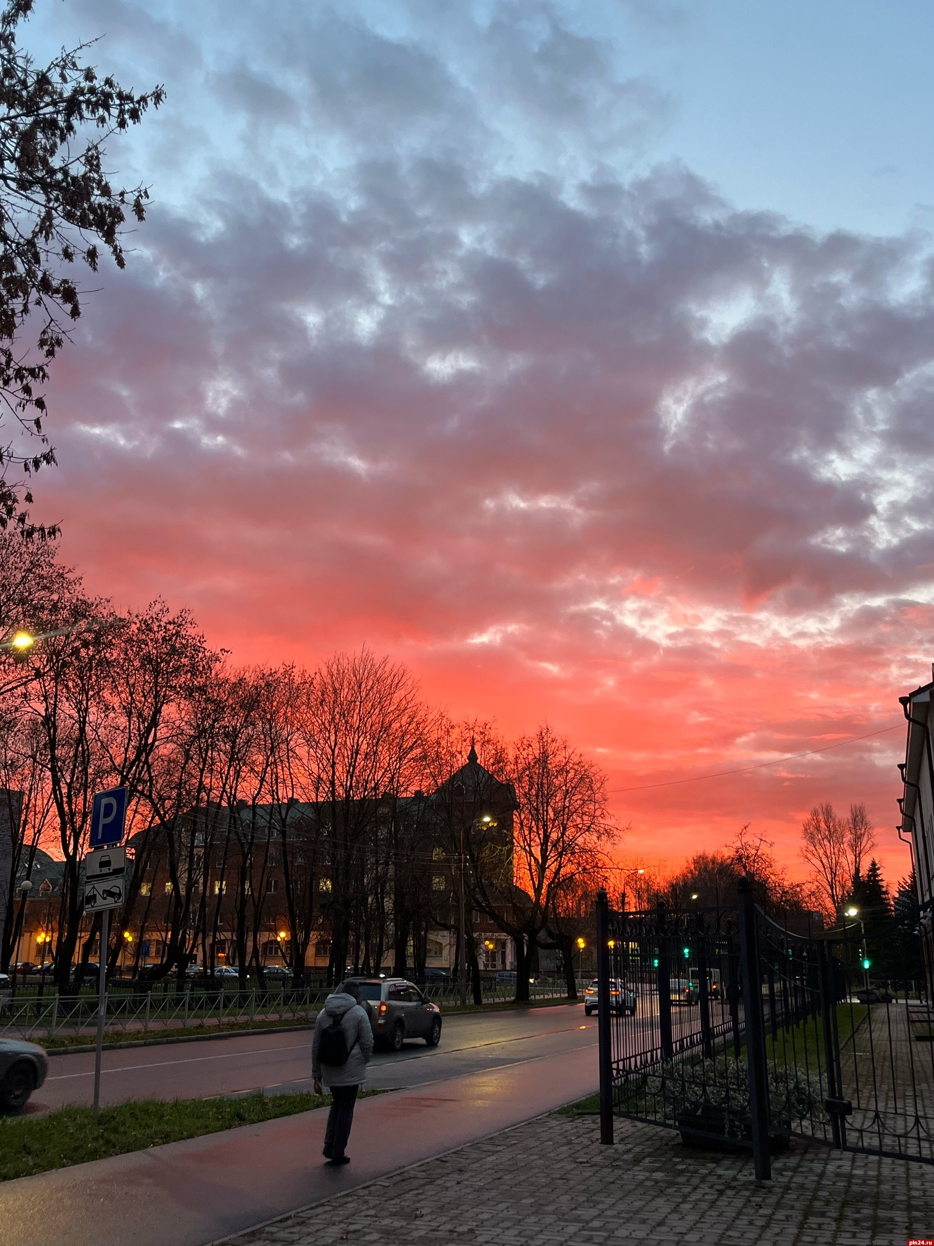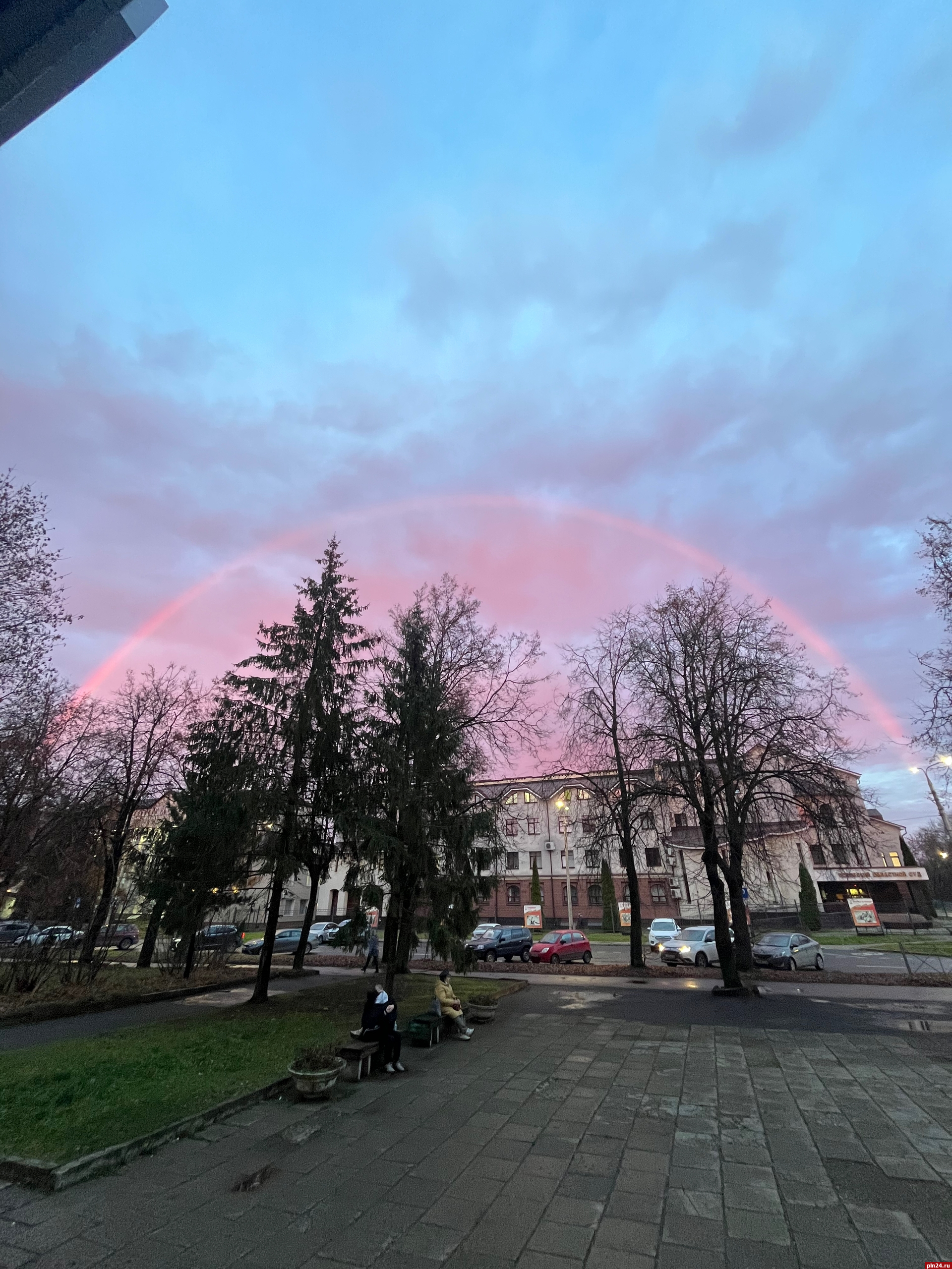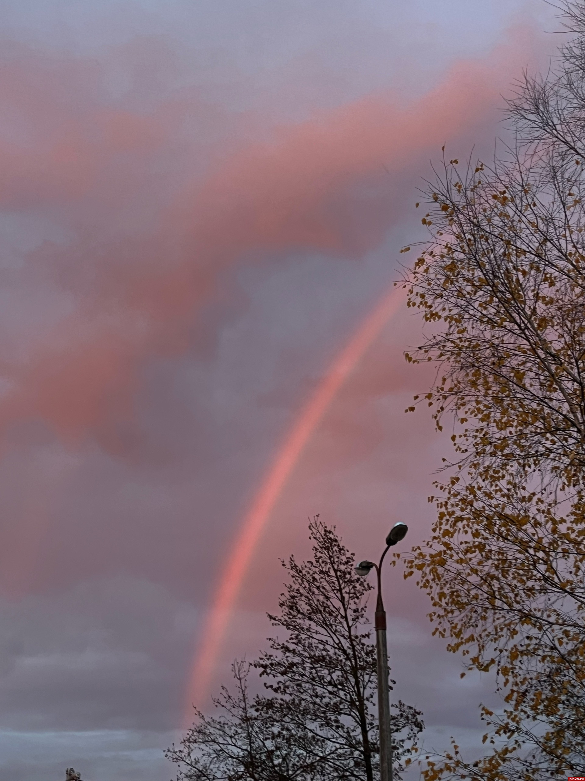 Необычную радугу наблюдают жители города Пскова вечером 7 ноября.