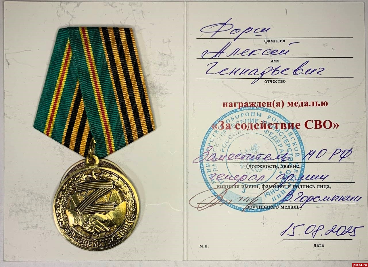 Депутата Псковской городской Думы Алексея Форша наградили медалью Министерства обороны РФ «За содействие СВО» на отчетно-выборной конференции псковского городского Совета ветеранов войны, труда, вооруженных сил и правоохранительных органов. Об этом депутат сообщил на своей странице «ВКонтакте».