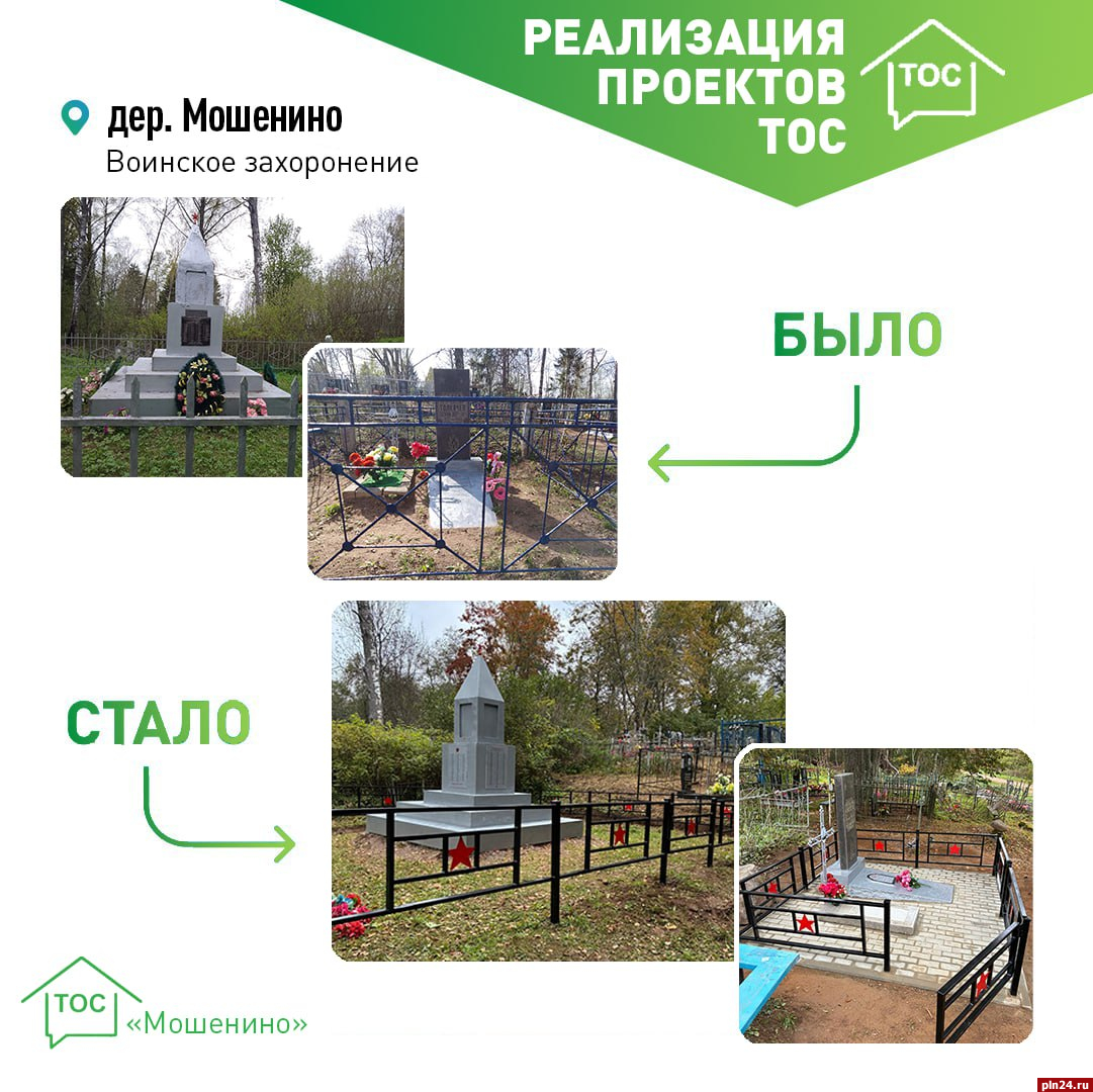 ТОС «Мошенино» стал победителем областного конкурса проектов, реализуемых ТОС с проектом «Благоустройство воинского захоронения павшим в годы Великой Отечественной войны 1941-1943 годов в деревне Мошенино». В ходе реализации проекта проведена замена ограждения воинского захоронения, ремонт обелиска, благоустроена могила Героя Советского Союза Василия Толкачева. Сумма реализованного проекта составила 400 тысяч рублей.