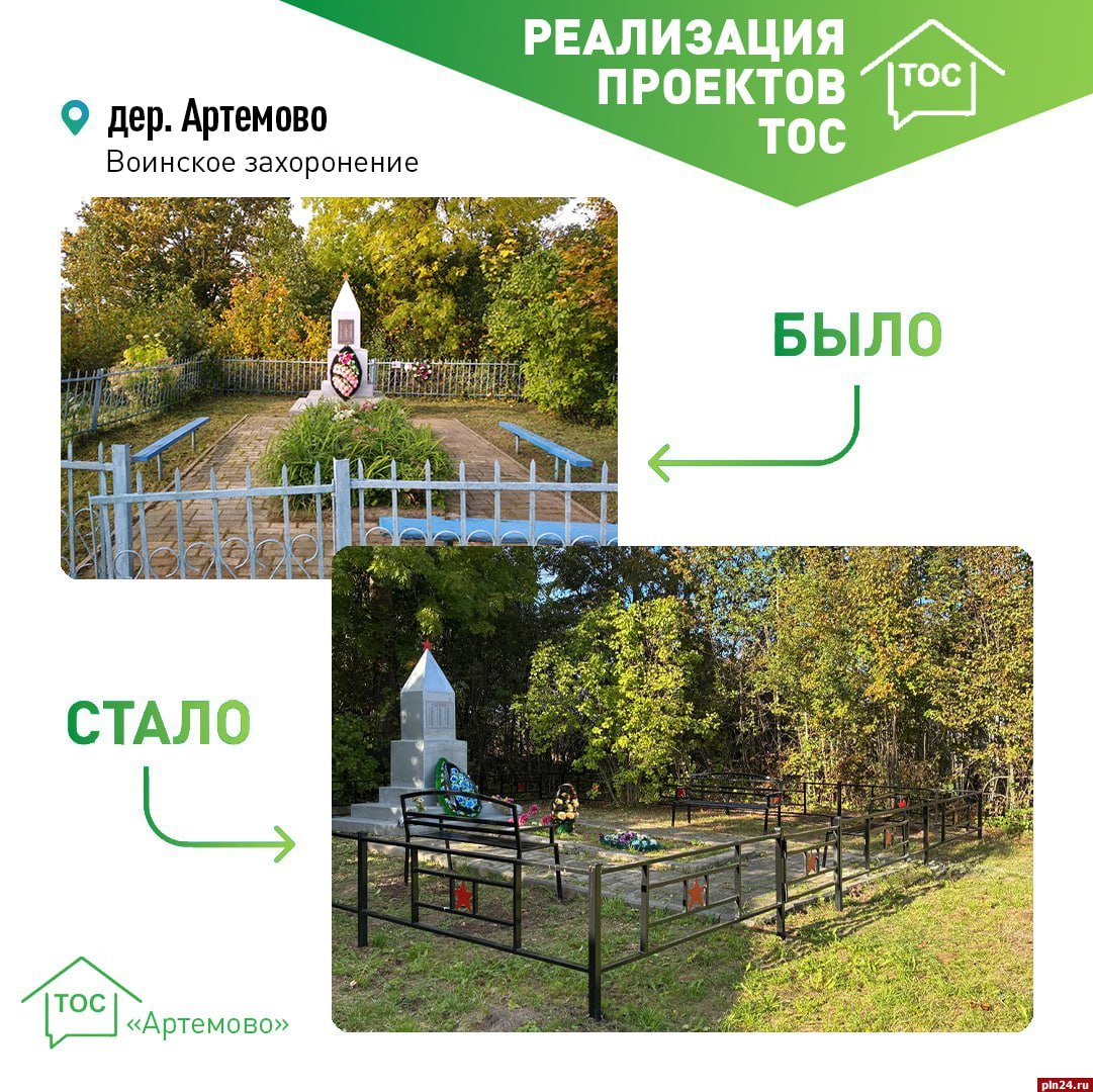 ТОС «Артемово» в 2025 году в ходе реализации проекта «Благоустройство воинского захоронения павшим в годы Великой Отечественной войны 1941-1943 годов в деревне Артемово» была проведена замена ограждения воинского захоронения и установлены 3 новые скамейки на сумму 250 тысяч рублей.