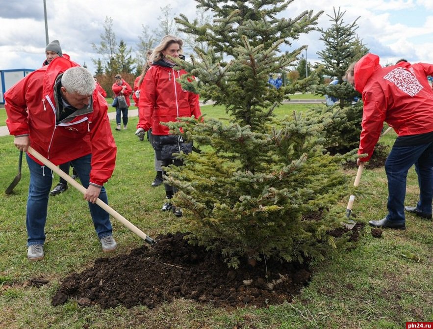 На фото: члены Совета Федерации от региона сажают ель в рамках акции по созданию Аллеи памяти «Псковская область — Родина Знамени Победы».
