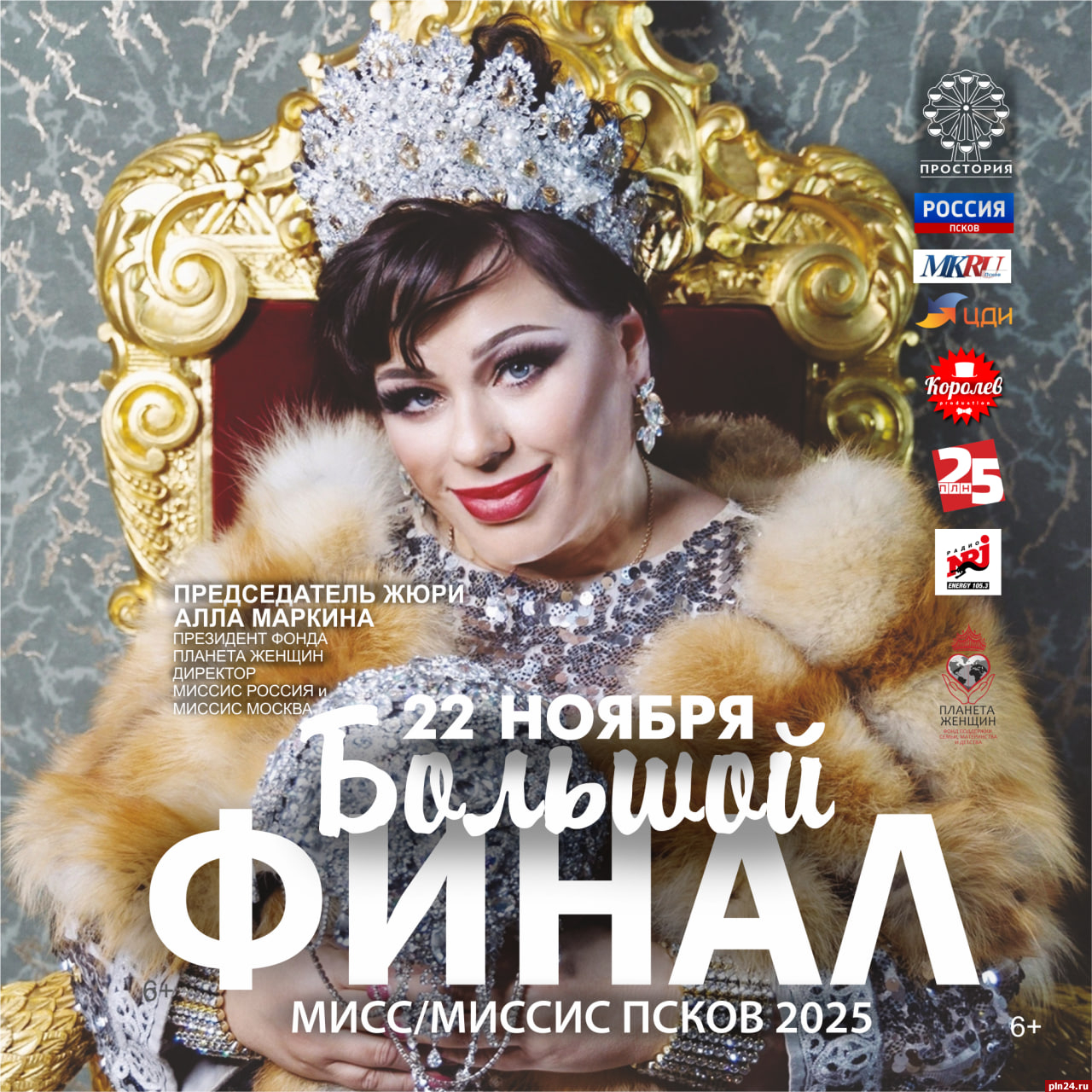 Председателем жюри 15-го юбилейного сезона «Миссис Псков» и 21-го сезона «Мисс Псков» станет президент фонда «Планета женщин», директор конкурсов «Миссис Россия» и «Миссис Москва» — Алла Маркина.