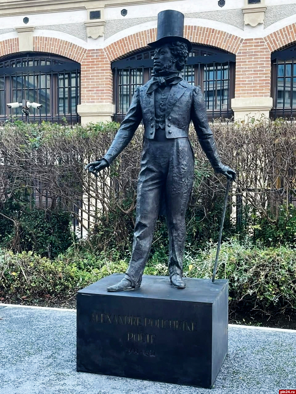 В «Михайловском», сотрудники которого поддерживают тесную связь с Пушкинским обществом в Латвии, рассказали, что этот памятник работы скульптора Александра Таратынова прибыл во Францию из Риги. В столице Прибалтийской республики, в рижском парке Кронвальда, он был установлен в августе 2009 года, через десять лет после того, как мэрия Риги поддержала инициативу латвийского Пушкинского общества об установке скульптуры поэта. В мае 2023 года памятник был демонтирован городскими властями, несмотря на протесты жителей и усилия его создателя. Художник пытался всеми способами защитить своё произведение, но его аргументы, в том числе и юридические, услышаны не были. Тогда скульптор добился того, чтобы его работу передали Франции.