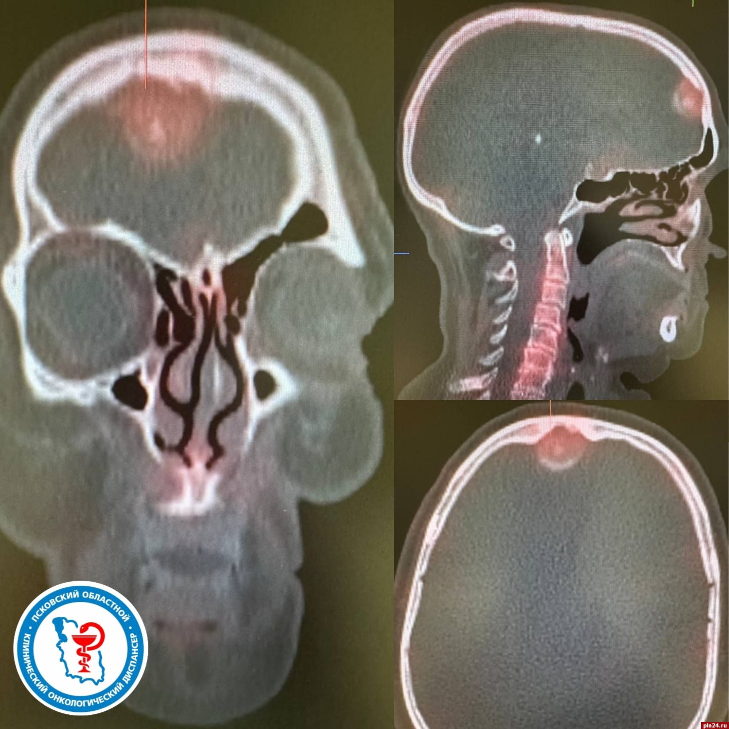 Затем пациентке провели ОФЭКТ-КТ (метод медицинской диагностики, сочетающий в себе однофотонную эмиссионную компьютерную томографию (ОФЭКТ) и рентгеновскую компьютерную томографию (КТ) - прим. ред.), в ходе которого в лобной области головного мозга было выявлено новообразование, которое плотно прилегало к лобной кости.