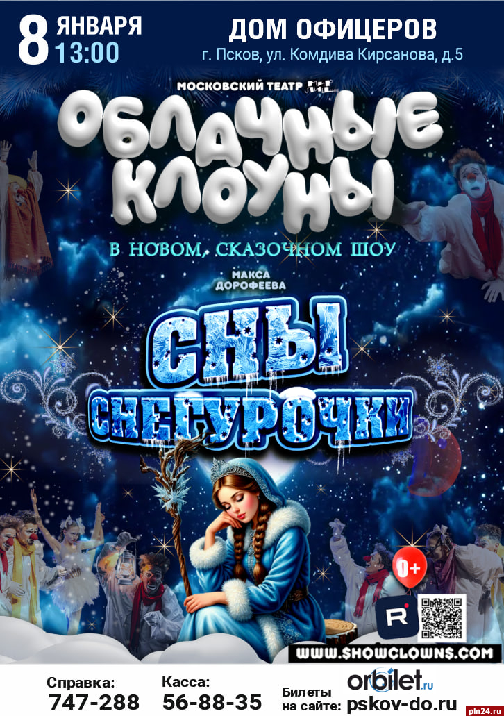 Московский театр «Мир лиц» 8 января представит псковичам шоу «Облачные клоуны» с новой сказочной программой «Сны Снегурочки».