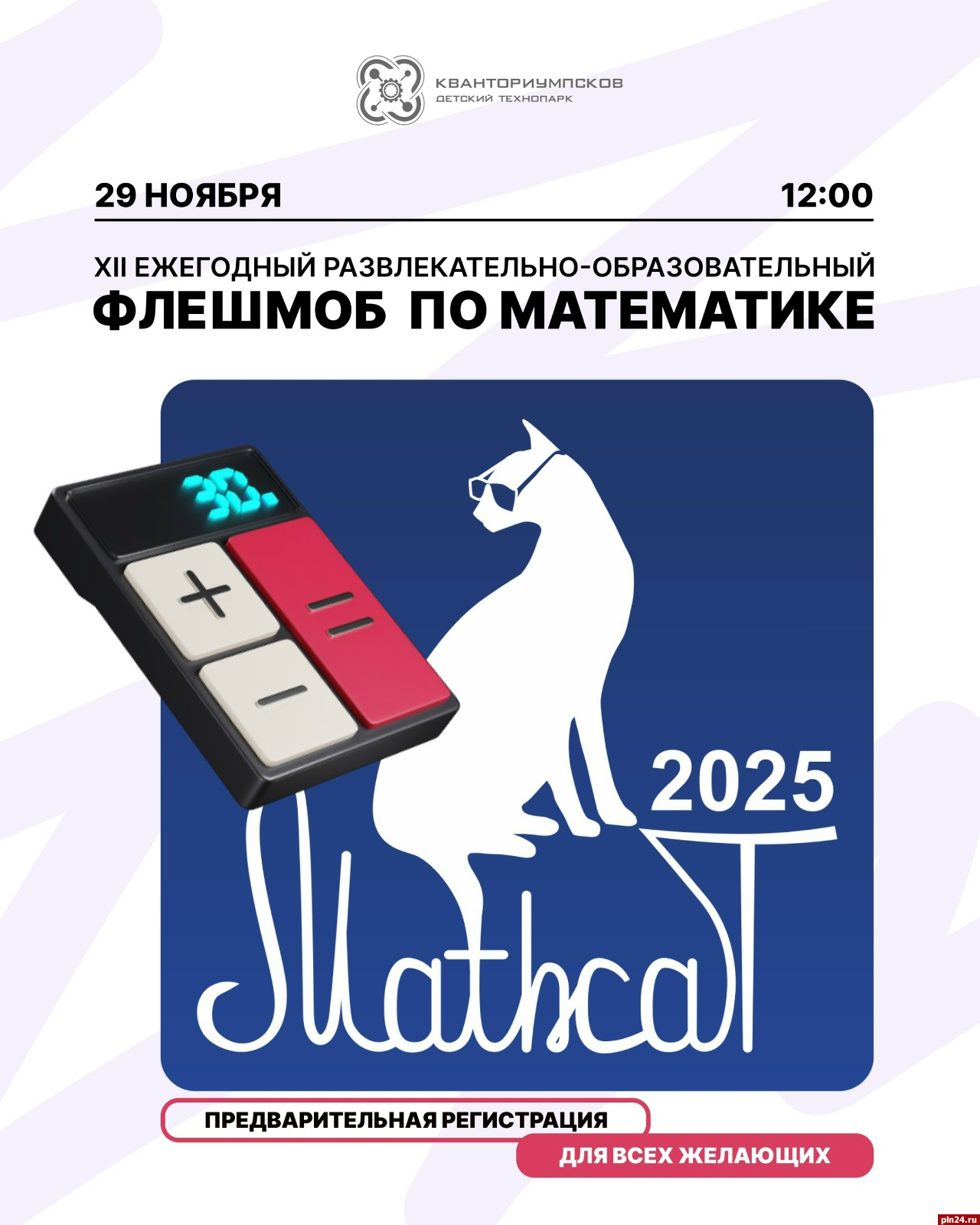 Детский технопарк «Кванториум» вновь станет площадкой для проведения XII ежегодного развлекательно-образовательного флешмоба по математике MathCat 29 ноября. Об этом Псковской Ленте Новостей сообщили в образовательной площадке.