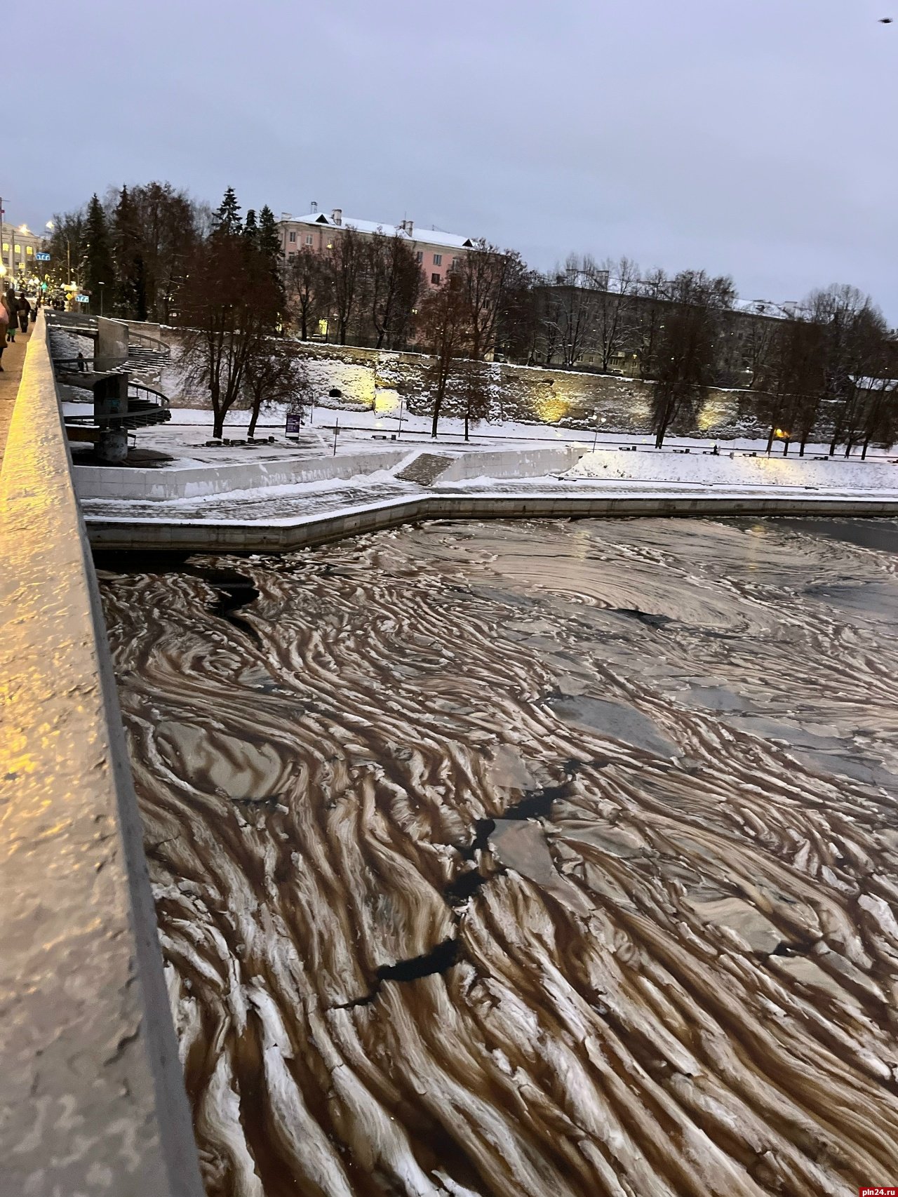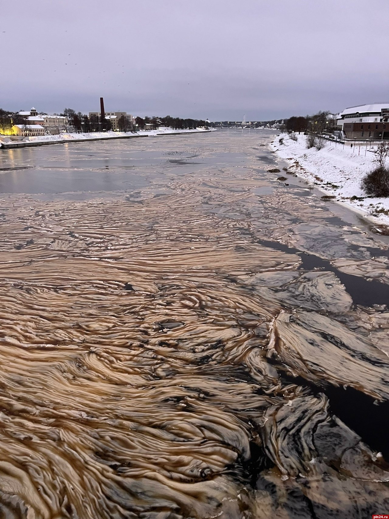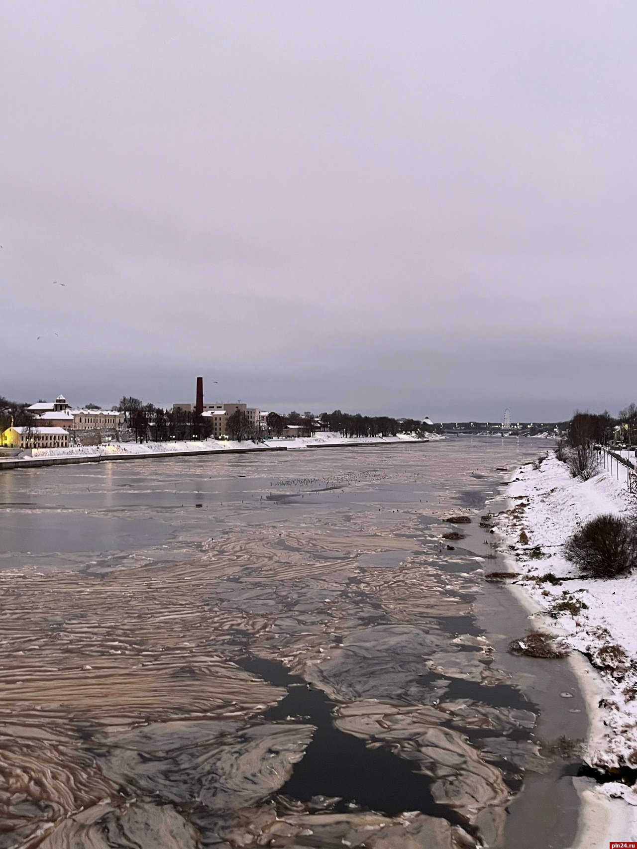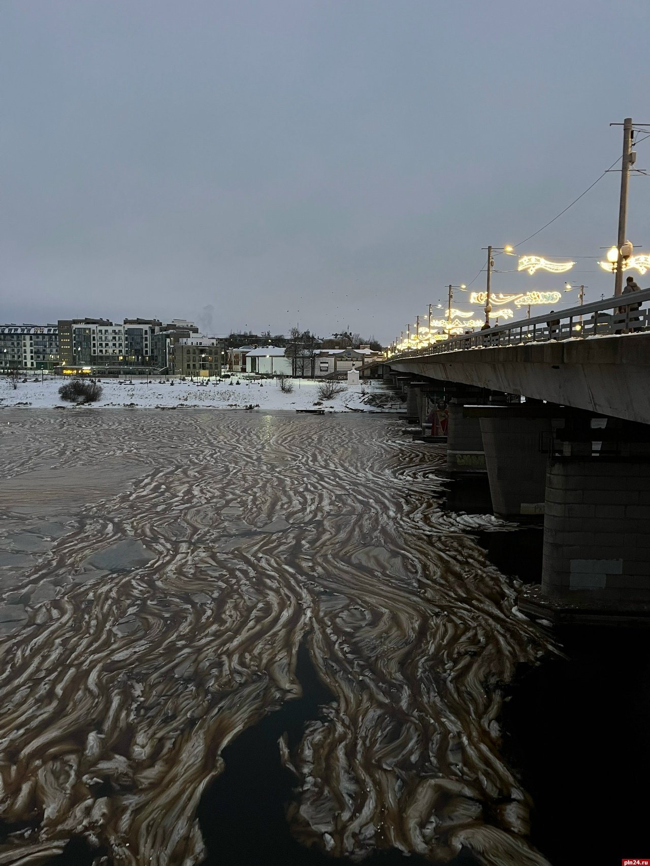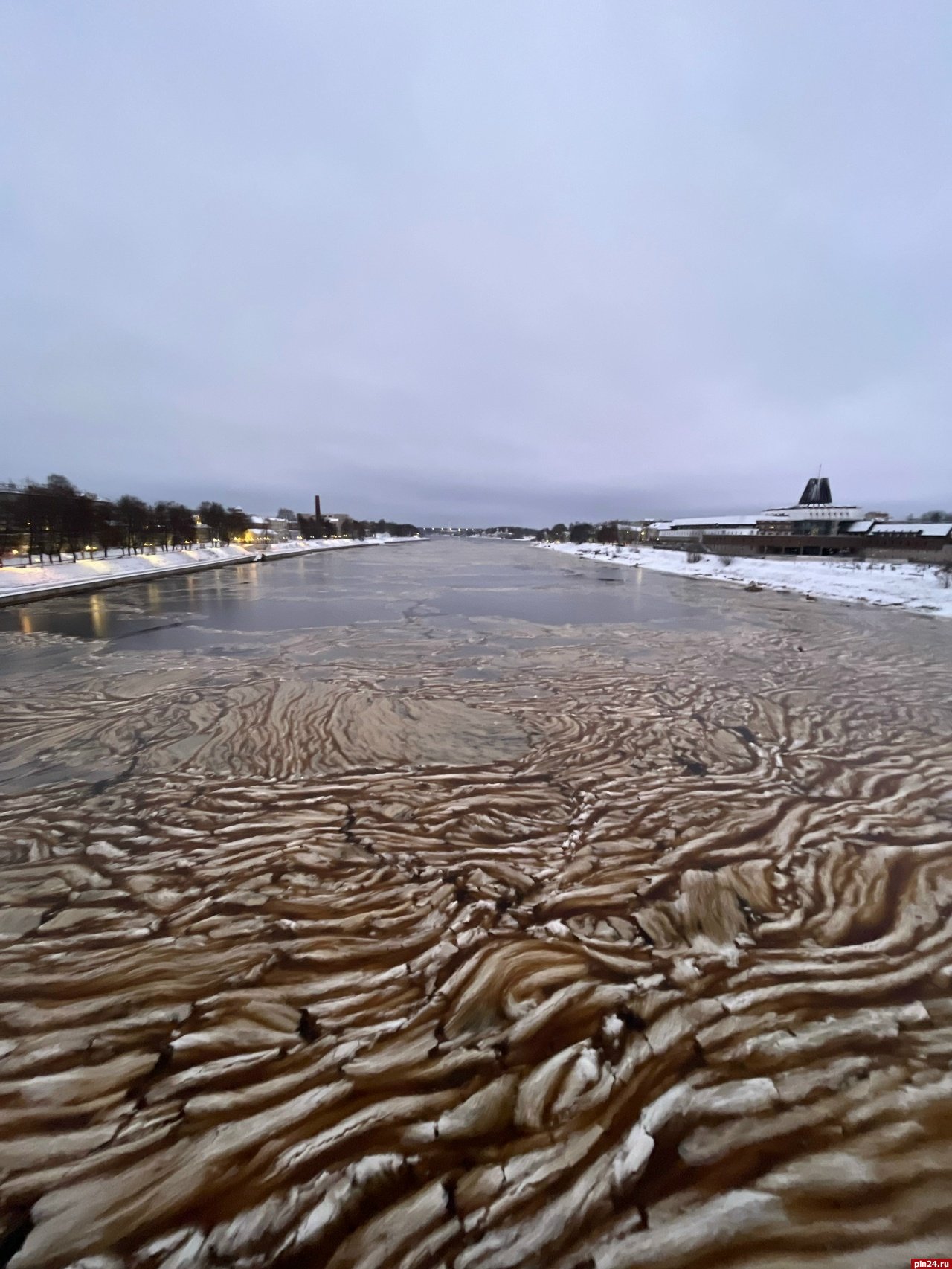 На поверхности реки Великой в Пскове совсем скоро может встать лед, а пока выпавший снег создает на открытой воде удивительные узоры, передает корреспондент Псковской Ленты Новостей.