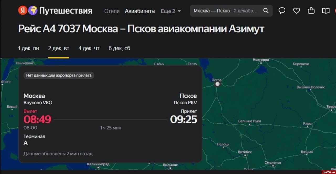 Утренний рейс Москва-Псков вылетел из аэропорта «Внуково» в 08:49, спустя 49 минут задержки, следует из данных онлайн-табло аэропорта «Внуково».