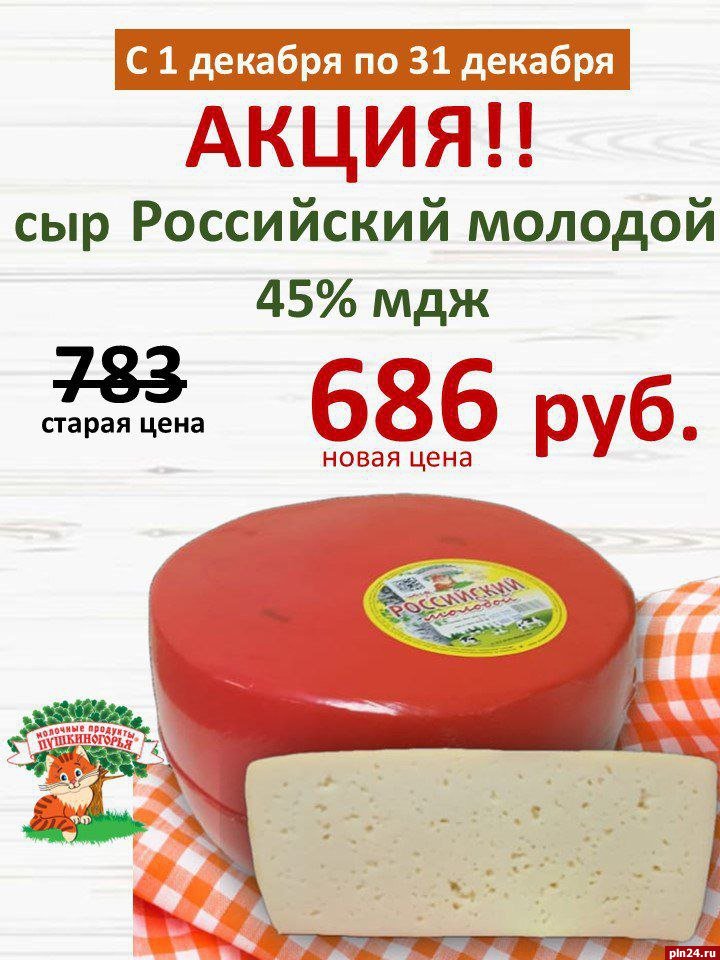 С 1 по 31 декабря сыр «Российский молодой» от «Молочных продуктов Пушкиногорья» можно приобрести по акции.