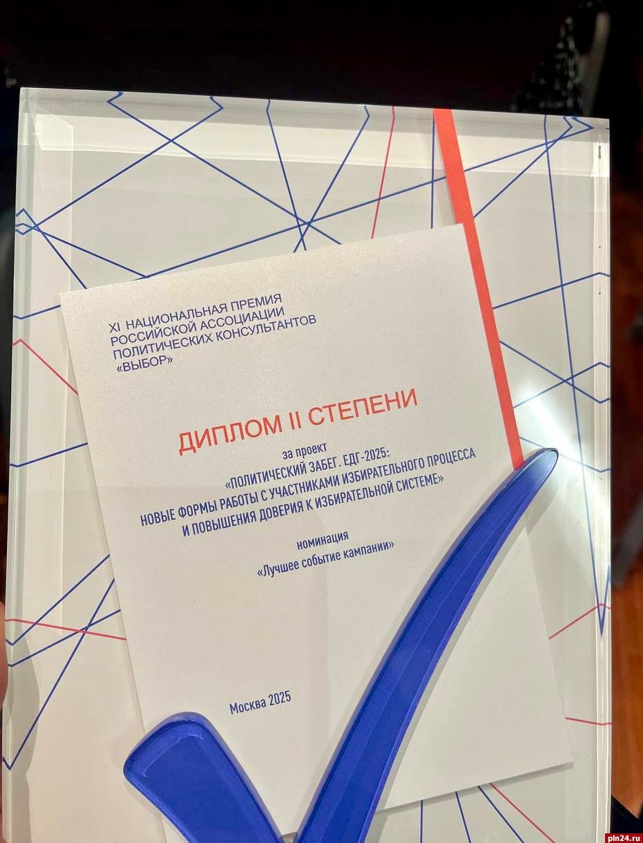 XI Национальная премия РАПК «Выбор» — ежегодная премия Российской ассоциации политических консультантов, состоялось в Москве вчера, 3 декабря. В номинации «Лучшее событие кампании» жюри присудило диплом II степени Избирательной комиссии Псковской области за проект: «Политический забег. ЕДГ-2025: новые формы работы с участниками избирательного процесса и повышения доверия к избирательной системе». Об этом сообщили в пресс-службе Избирательной комиссии Псковской области.