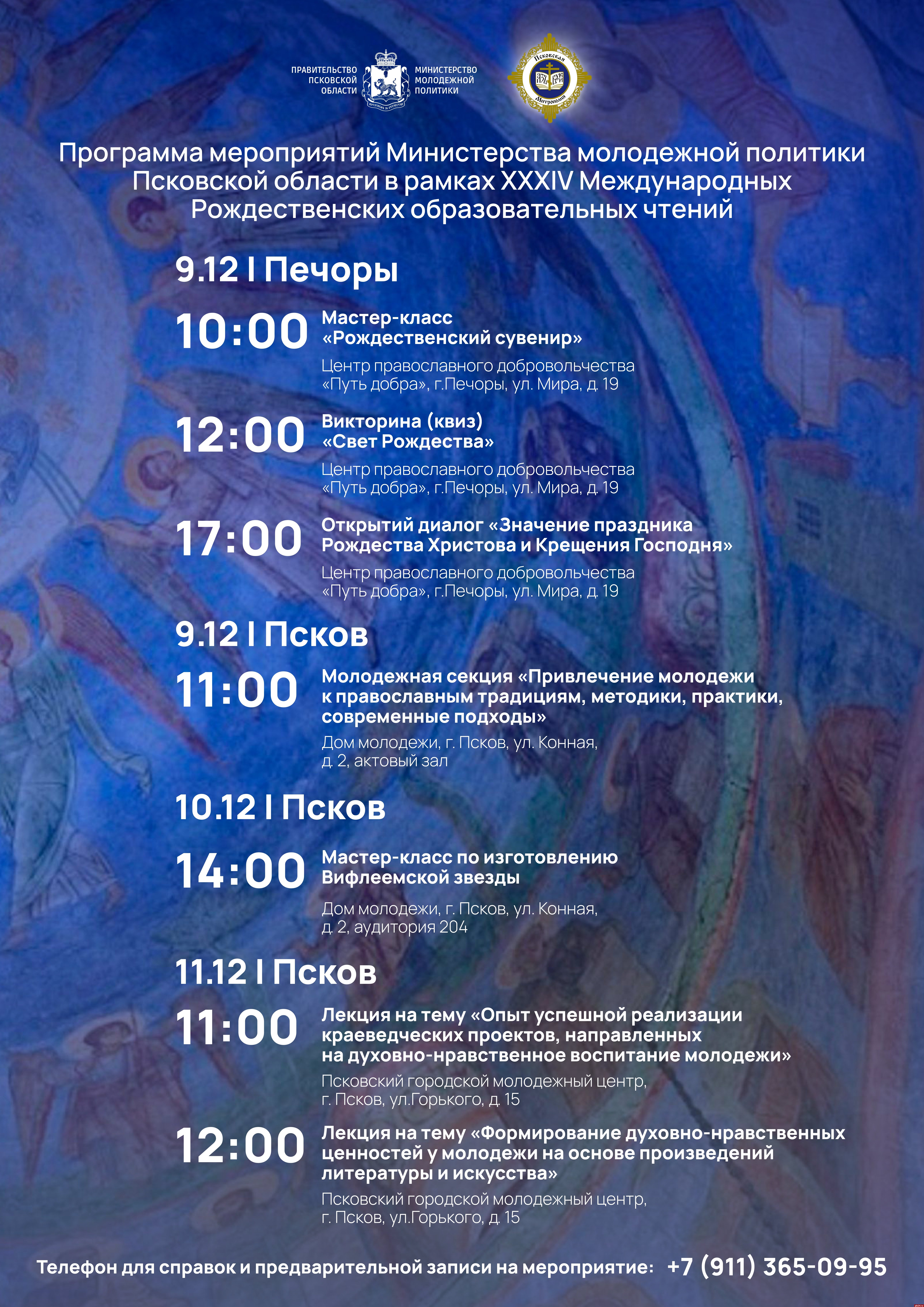 Министерство молодежной политики Псковской области представило программу участия в XXXIV Международных Рождественских образовательных чтениях, которые пройдут 9–11 декабря в Печорах и Пскове. Мероприятия организованы совместно с Псковской епархией и направлены на приобщение молодежи к православным традициям, духовно-нравственным ценностям и волонтерскому служению. Об этом Псковской Ленте Новостей сообщили в министерстве.