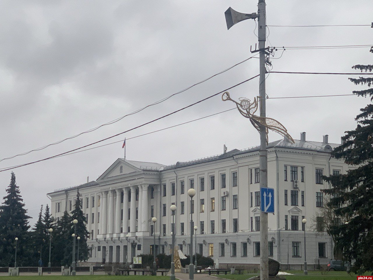 В преддверии Нового года главные улицы Пскова продолжают преображаться: теперь на световых опорах от площади Ленина до Октябрьской площади установили праздничные световые инсталляции — парящие фигуры трубящих ангелов.
