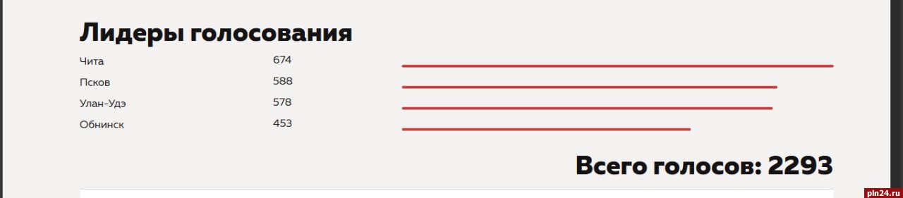 На данный момент в голосовании лидирует Чита с 674 голосами. Псков занимает второе место с 588 голосами, Улан-Удэ — третье с 578 голосами, а Обнинск набрал 453 голосов. Разрыв между городами в тройке лидеров небольшой, идёт напряженная борьба.