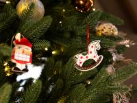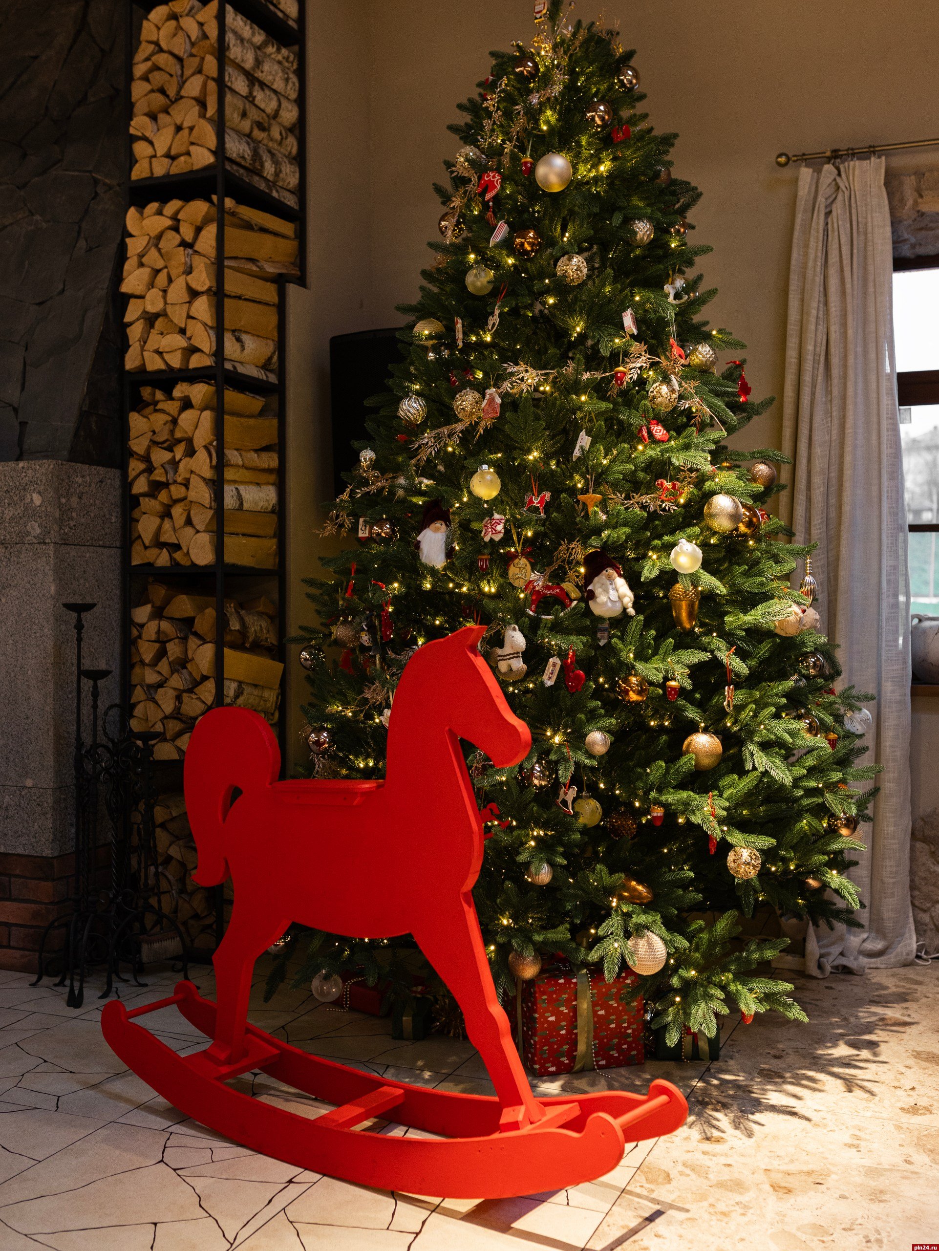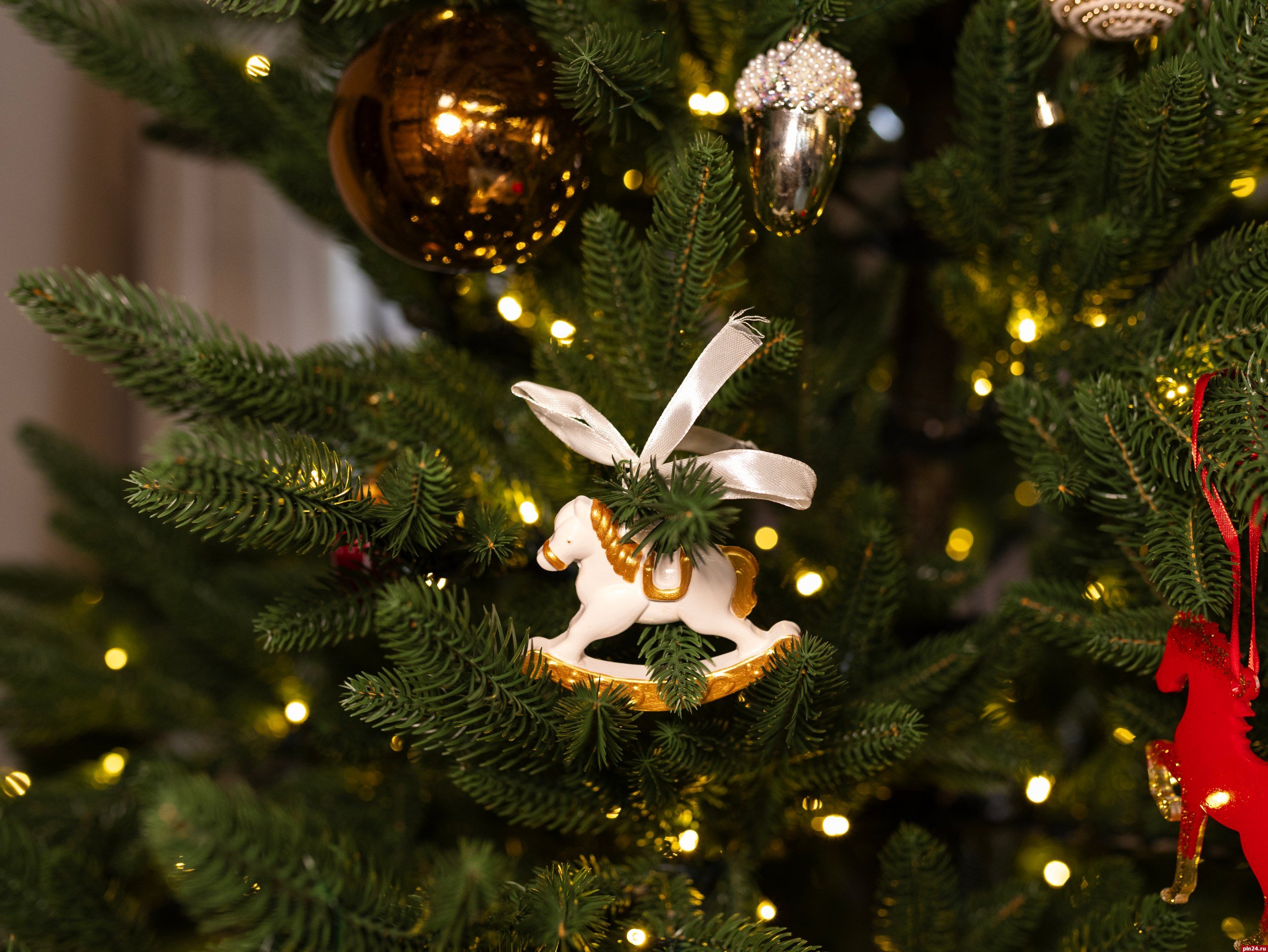 Убранство дерева — результат труда более тридцати псковских мастеров, вдохновленных местными традициями. Основными темами оформления стали «Русский новый год» и символ наступающего 2026 года — «Красная огненная лошадь». На ветвях красуются керамические и стеклянные лошадки, резные деревянные фигурки, валяные из шерсти, вязаные украшения, а также изделия в технике папье-маше.