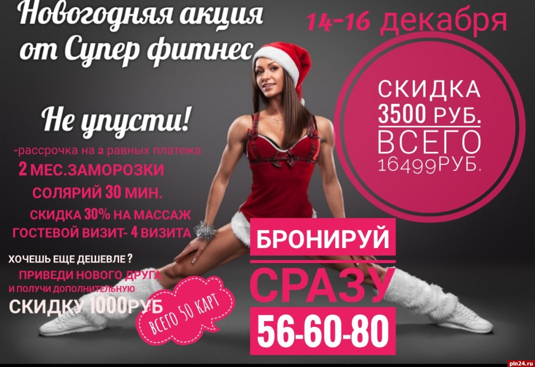 Клуб «Супер фитнес» дарит скидки на годовые абонементы в преддверии Нового года. Как сообщили Псковской Ленте Новостей в фитнес-центре, только с 14 по 16 декабря можно приобрести карту на год со скидкой 3500 рублей.