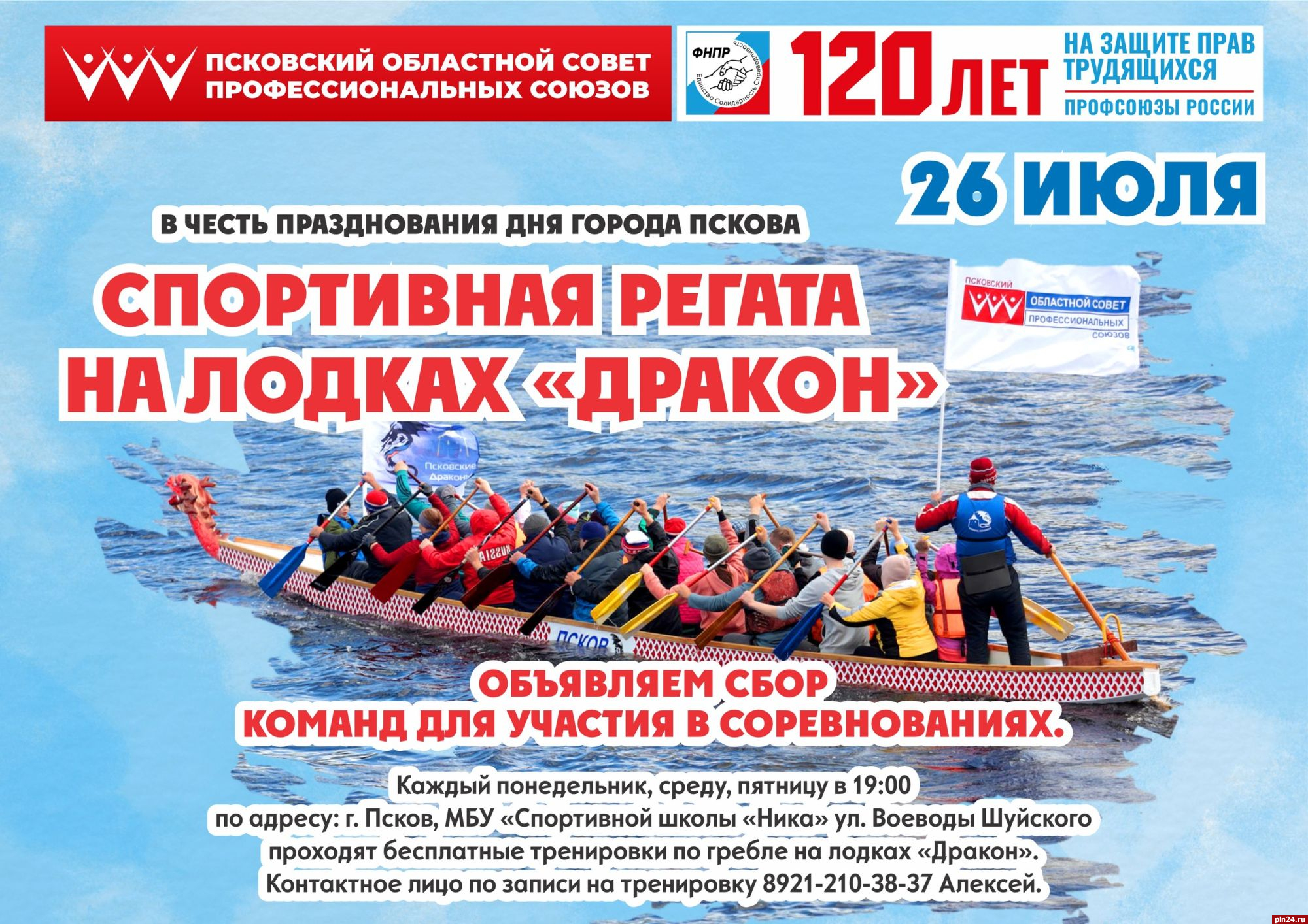 Продолжается набор профсоюзных команд для участия 26 июля в спортивной регате на лодках «Дракон», сообщили Псковской Ленте Новостей в региональном профсоюзном объединении Псковской области.