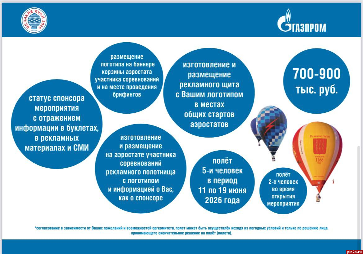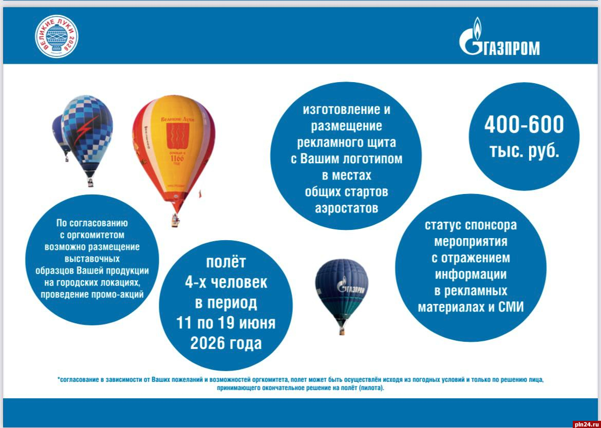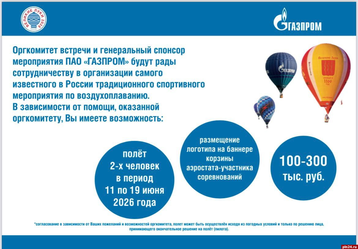 Оргкомитет Международной встречи воздухоплавателей в Великих Луках открывает приём заявок от спонсоров и благотворителей, желающих стать частью одного из самых ярких и ожидаемых событий в мире спортивного воздухоплавания, сообщили в официальном Telegram-канале мероприятия.