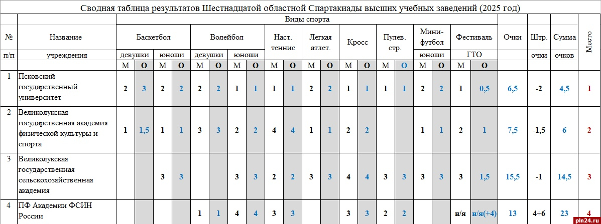 Шестнадцатая областная спартакиада вузов завершилась в Псковском регионе. Результаты разместил «Центр спортивной подготовки Псковской области» в группе сети «ВКонтакте».