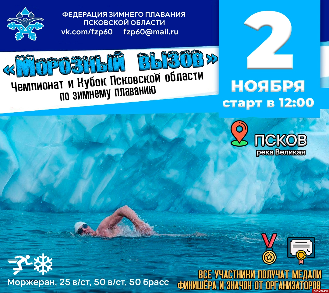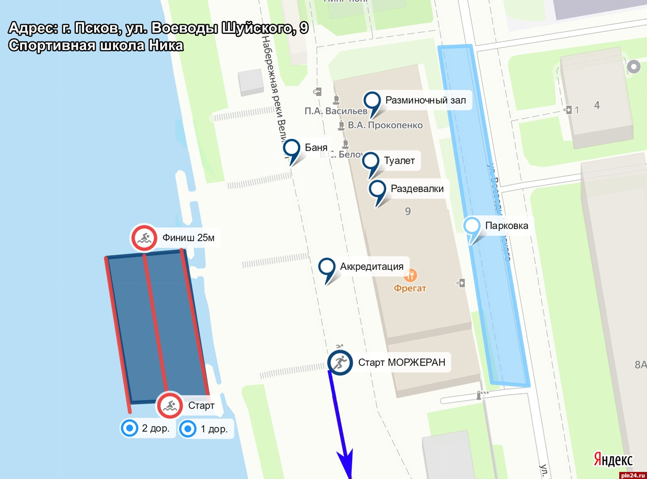 Чемпионат и Кубок Псковской области по зимнему плаванию «Морозный вызов» пройдут напротив спортивной школы «Ника» 2 ноября по адресу: город Псков, улица Воеводы Шуйского, дом 9, сообщили Псковской Ленте Новостей в Федерации зимнего плавания Псковской области и предоставили маршрут и карту соревнований.