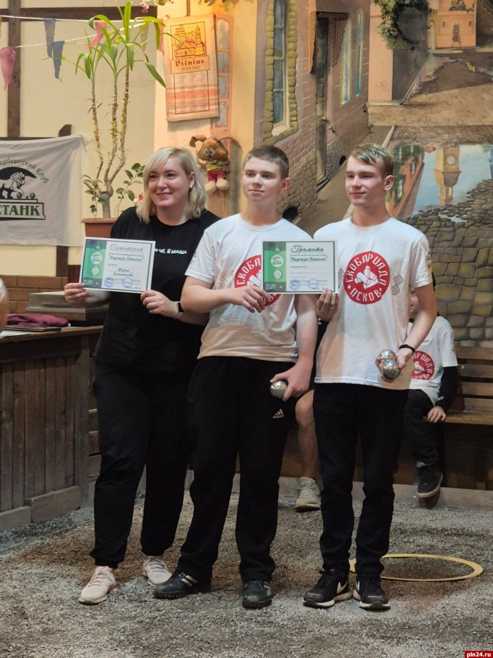 Для псковских команд турнир складывался по-разному, поскольку их ждала встреча с достойными соперниками из Москвы, Бреста, Санкт-Петербурга и Ленинградской области. После пяти отборочных игр в финальную часть турнира вышла псковская команда «Соседи», которую представляли учащиеся Москвинской школы Юрий Андреев и Дмитрий Васильев под руководством наставника Марии Большаковой. В полуфинале им противостояла команда «КсИл» из Приозёрска, которая выиграла все пять отборочных игр и считалась одним из фаворитов турнира. Но петанк – очень непредсказуемая игра, где даже один бросок может решить исход поединка. Так, после нескольких неудачных бросков соперников «Соседи» выиграли со счётом 7:6.