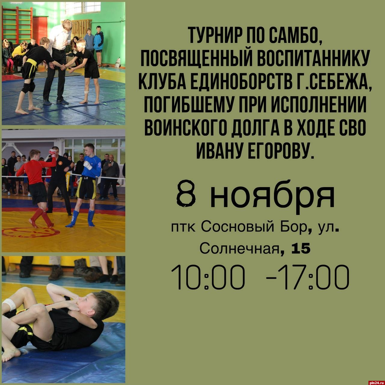 В поселке городского типа Сосновый Бор Себежского района состоится открытый турнир по самбо, посвященный памяти воспитанника себежского клуба единоборств Ивана Егорова, погибшего при исполнении воинского долга в ходе специальной военной операции. Об этом Псковской Ленте Новостей сообщил тренер по дзюдо и самбо клуба «Ирбис» из Себежа Багаудин Абдурахманов.