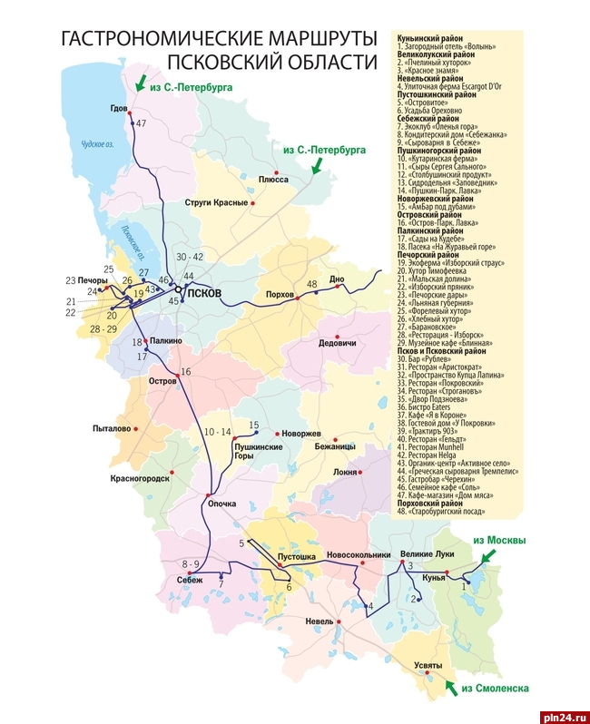 Все предлагаемые туристам точки этого маршрута не объедешь и за неделю. Потому что гастрообъекты есть в каждом районе Псковской области!