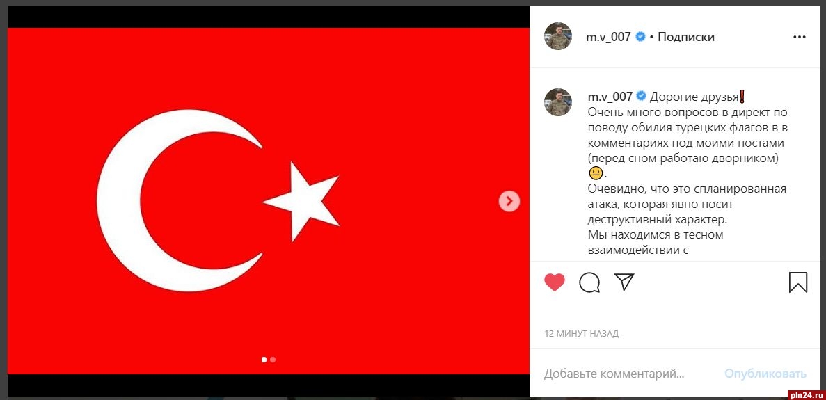 «Очень много вопросов в директ по поводу обилия турецких флагов в комментариях под моими постами (перед сном работаю дворником). Очевидно, что это спланированная атака, которая явно носит деструктивный характер. Мы находимся в тесном взаимодействии с соответствующими структурами, уверен, что в ближайшее время с этой историей они профессионально разберутся», - написал он.
